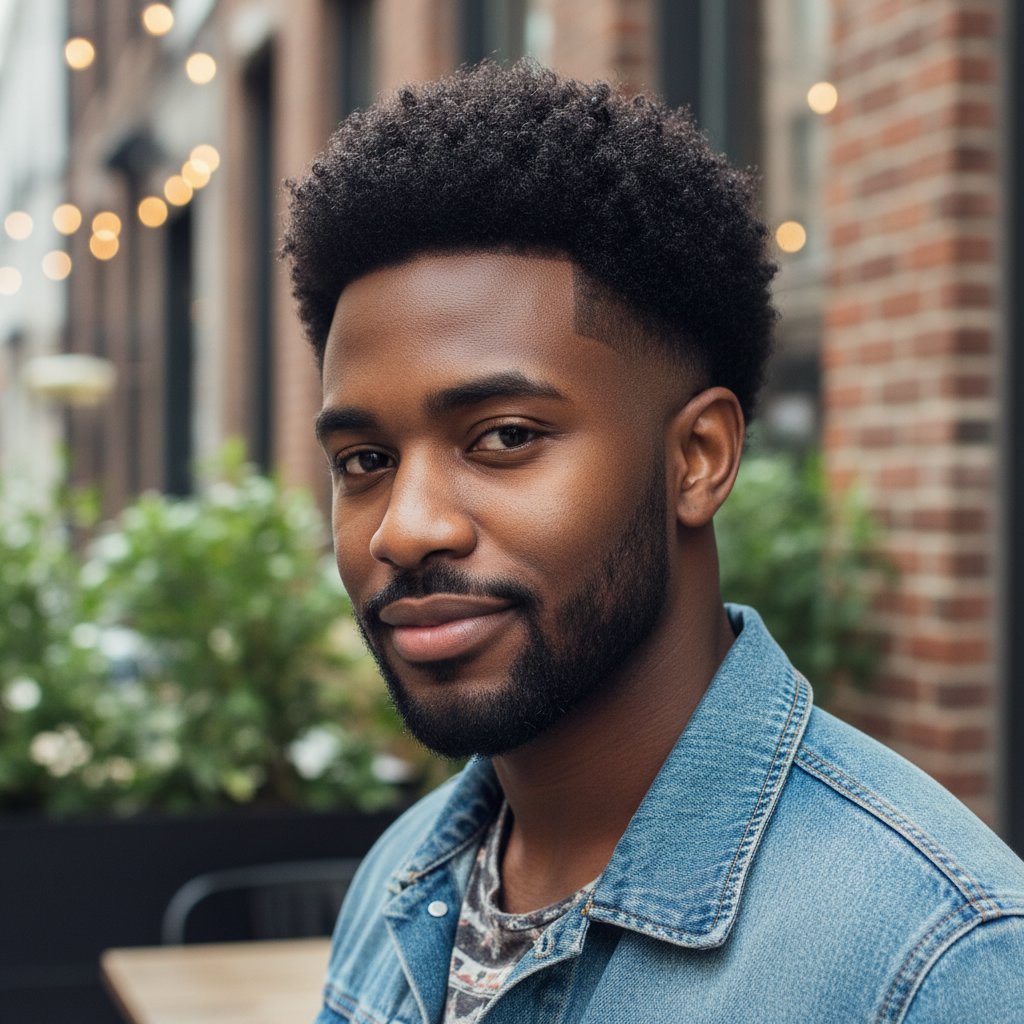 An Afro with a side part introduces structure to the natural shape, offering a fresh perspective on classic Afro styling.