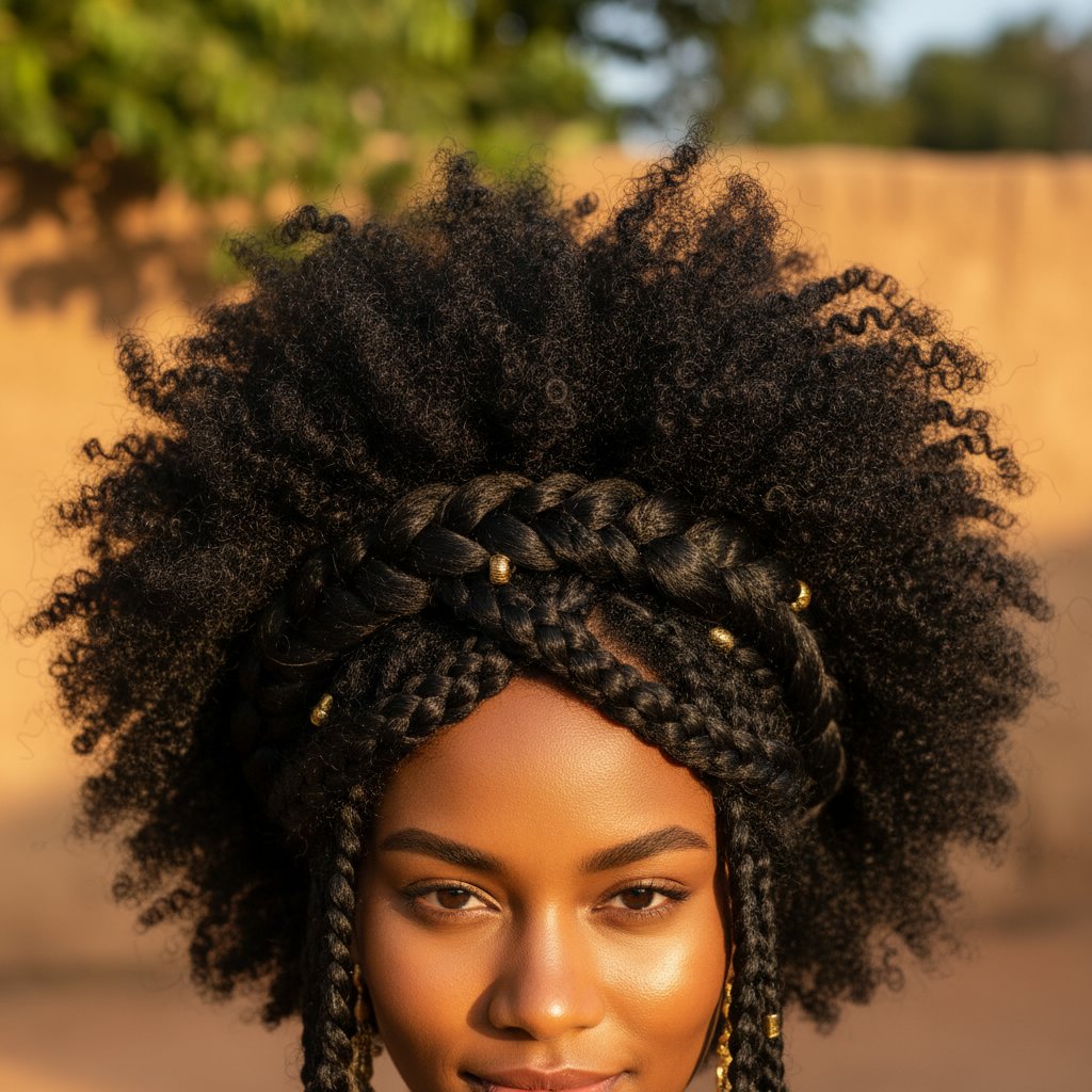 Incorporating a braided crown into an Afro adds a touch of elegance, celebrating the versatility of natural hair.