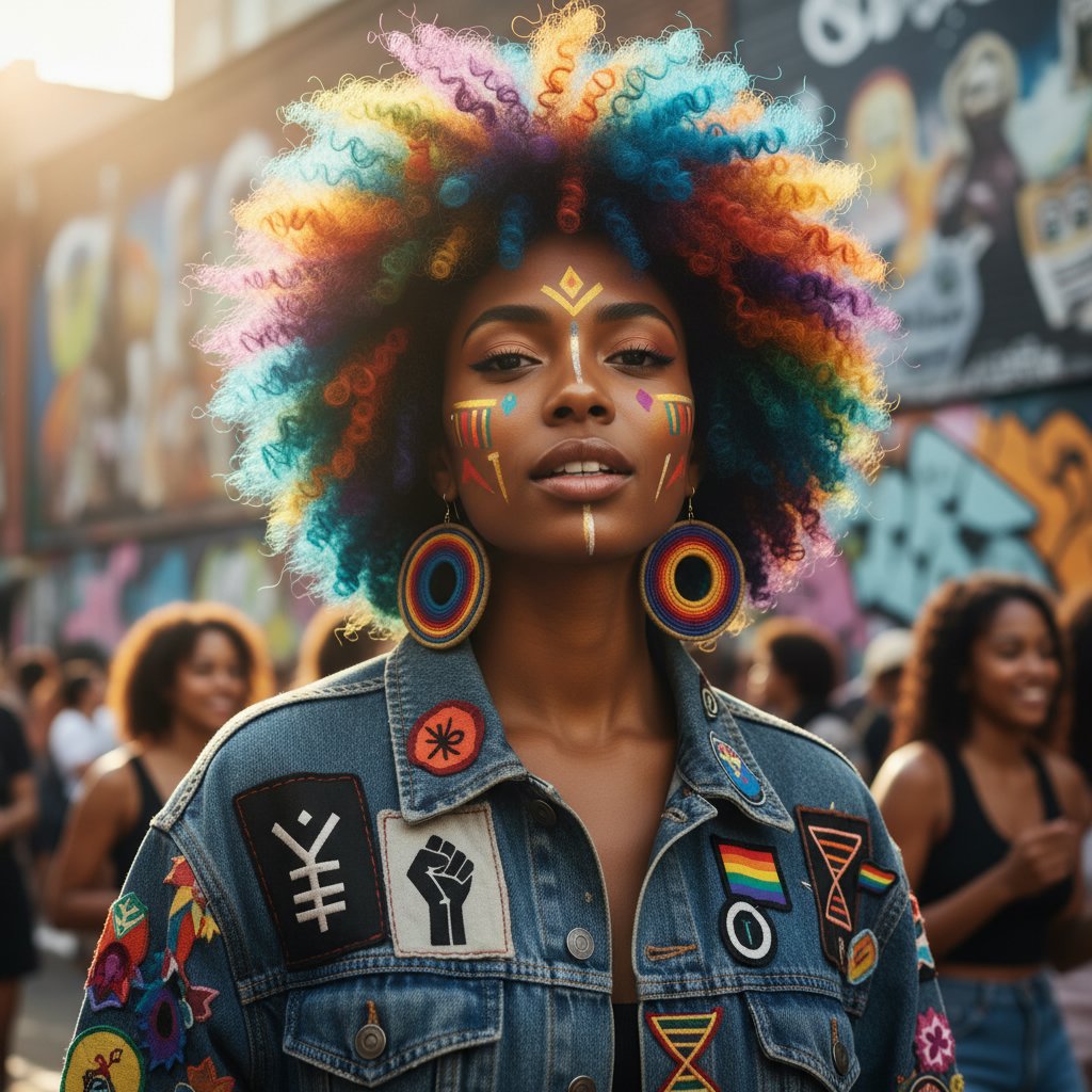 A colorful Afro makes a bold statement, embracing the fun and freedom of expressing one's identity through hair.