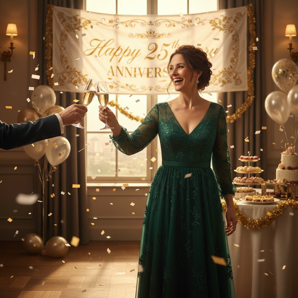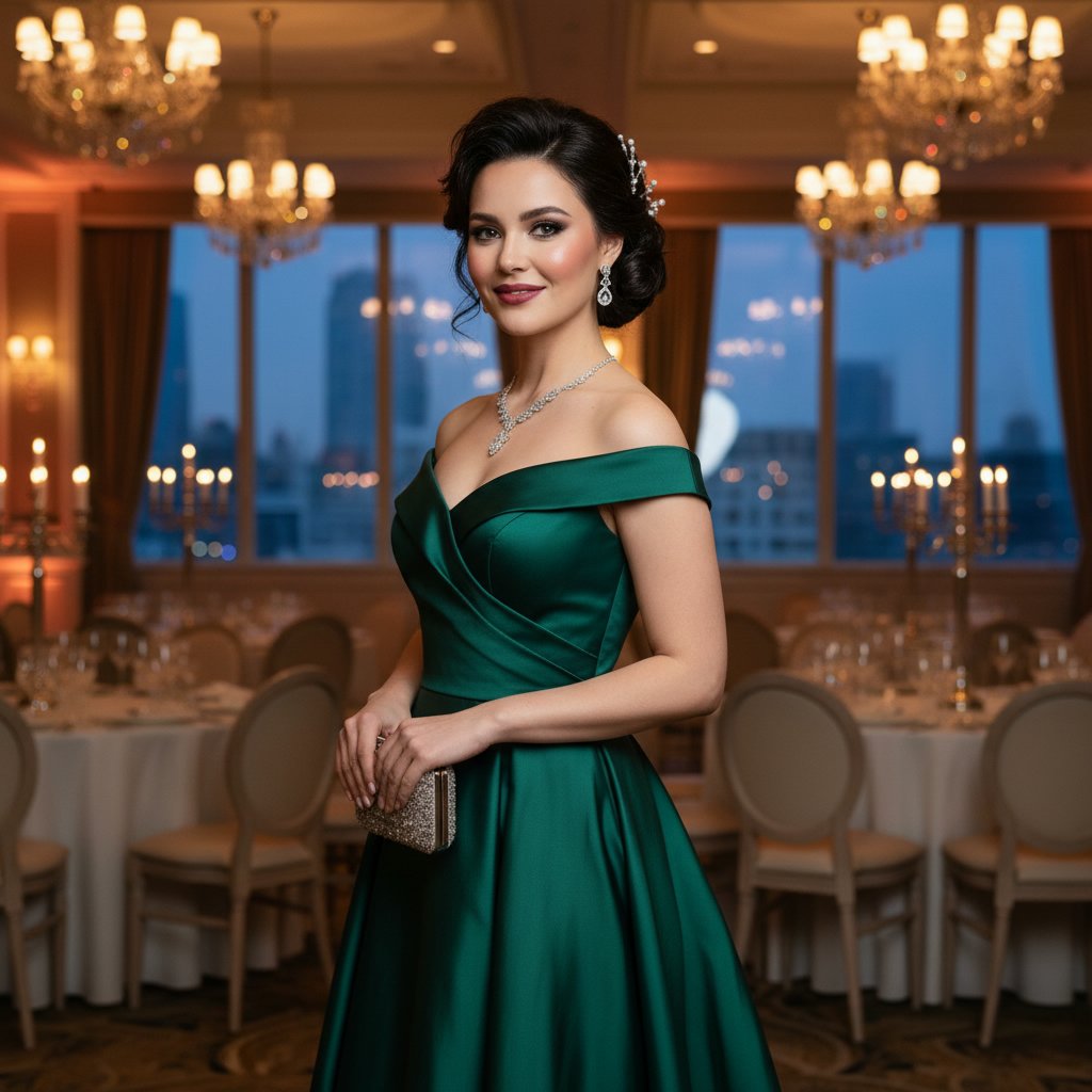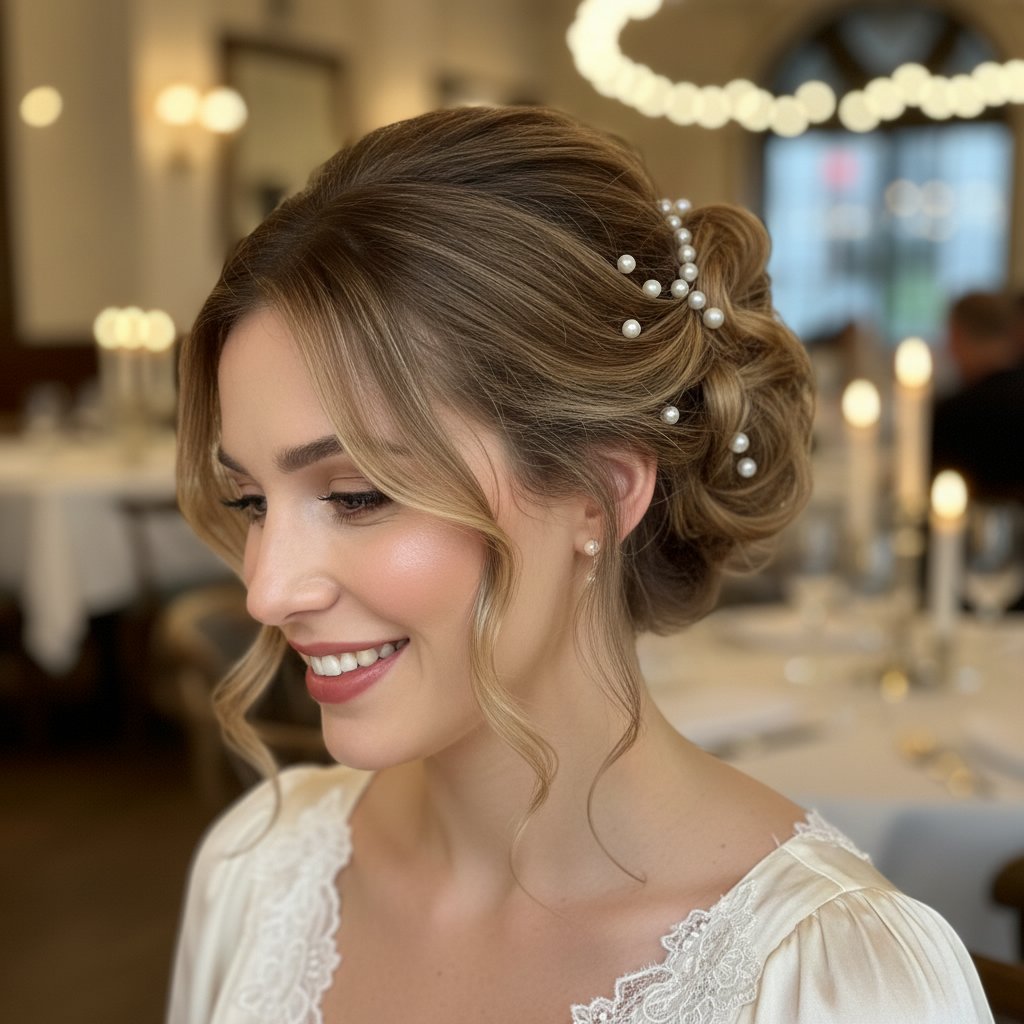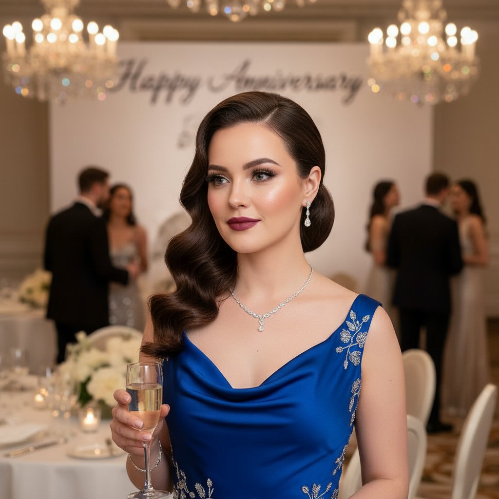 A romantic tousled updo, adorned with pearls or crystals, adds a touch of luxury to your anniversary ensemble.