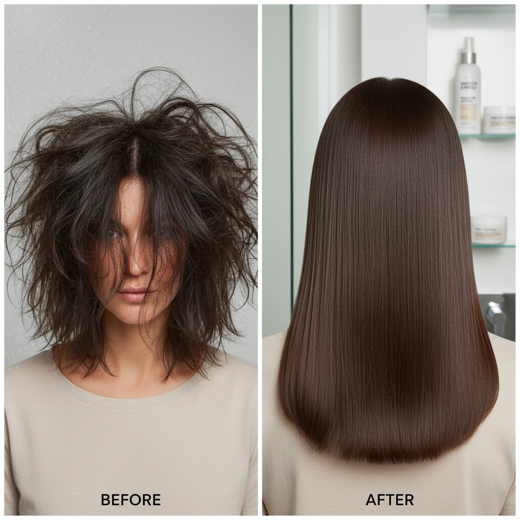 Before: Wavy and prone to frizz. After: Straight, sleek hair that lasts all day, courtesy of a smoothing serum.