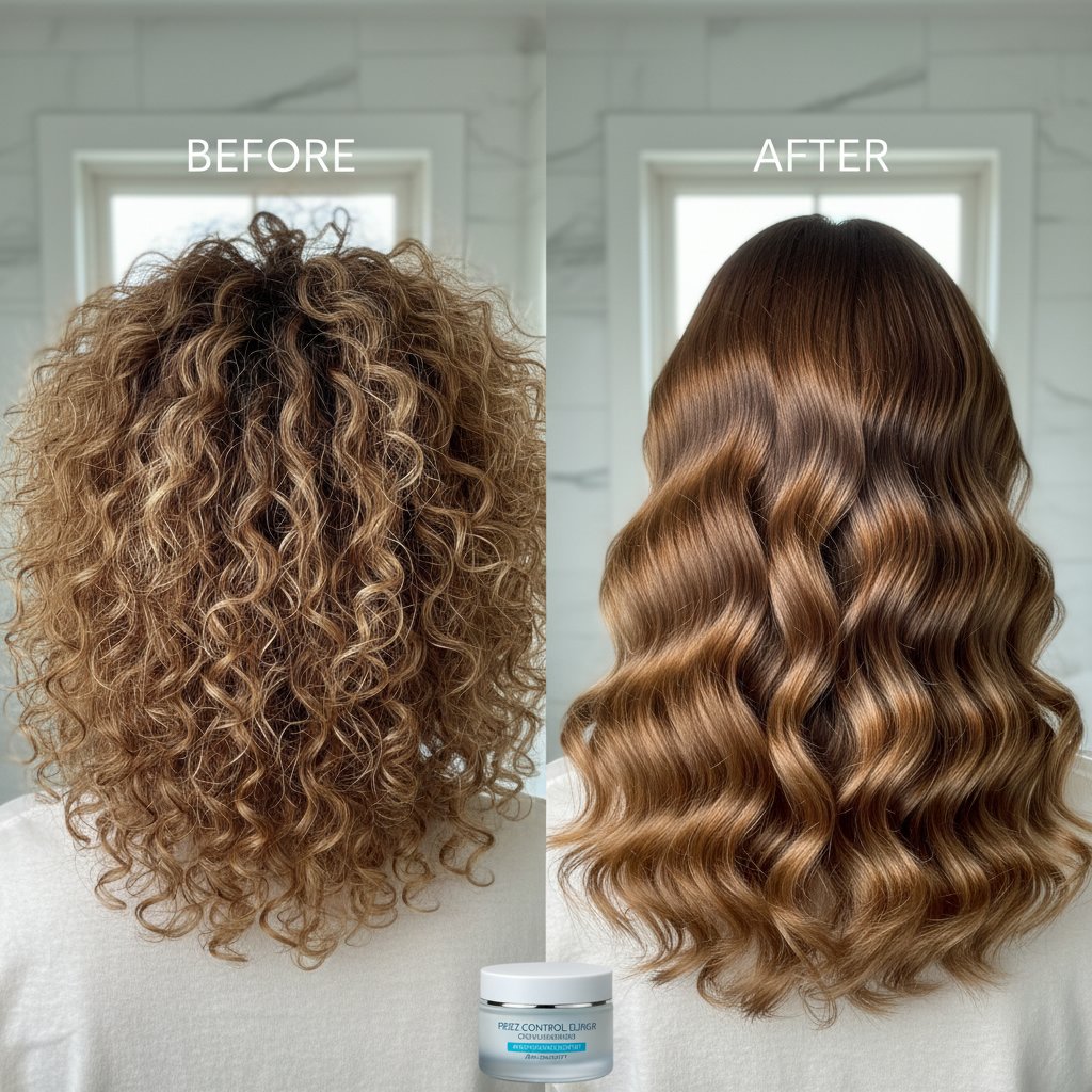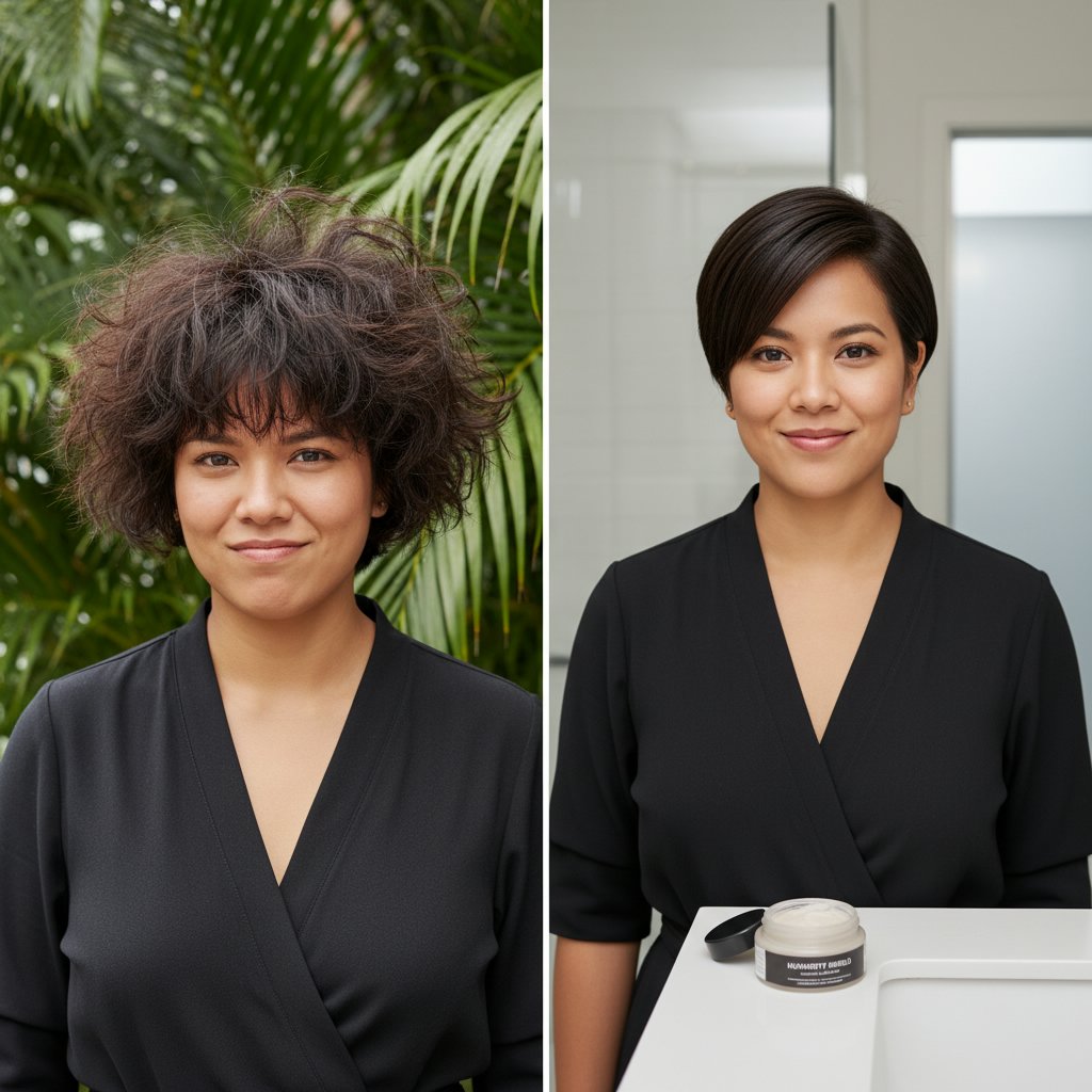 Before: Frizz-prone, unruly hair. After: Sleek, smooth locks achieved with anti-humidity spray, defying even the muggiest conditions.