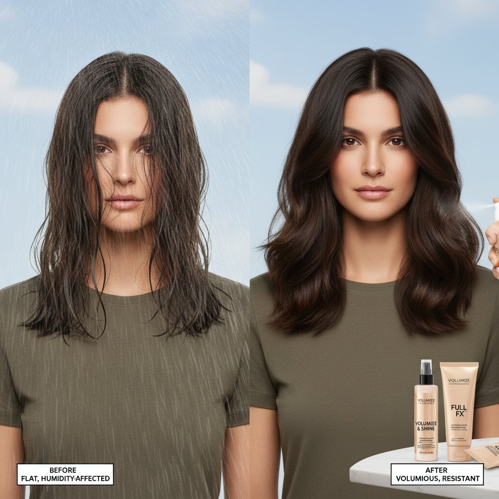 Before: Flat, lifeless hair due to overcompensation for humidity. After: Voluminous, lively hair maintained with volumizing, anti-humidity products.