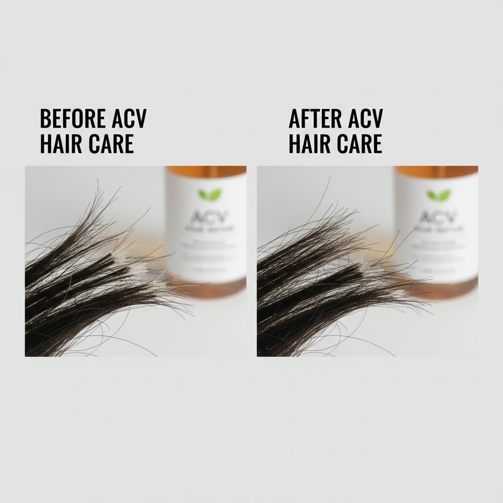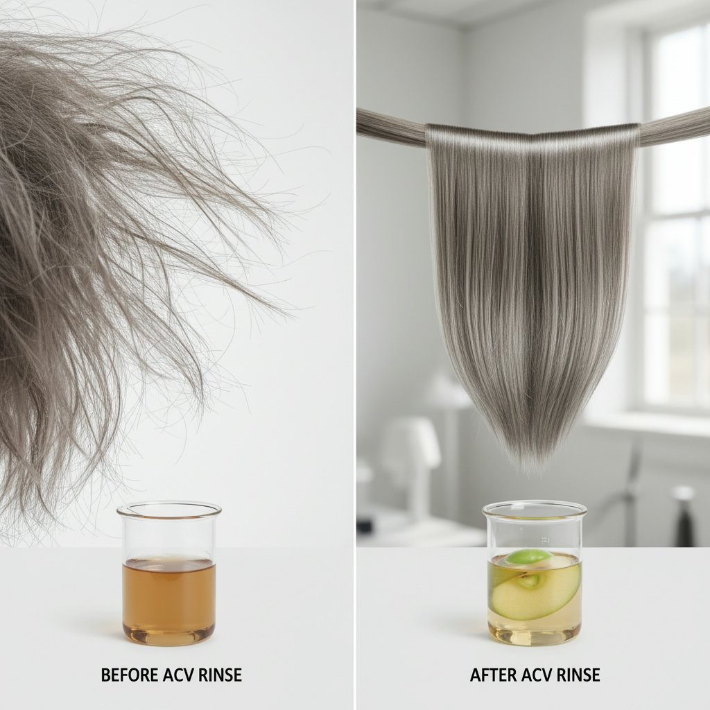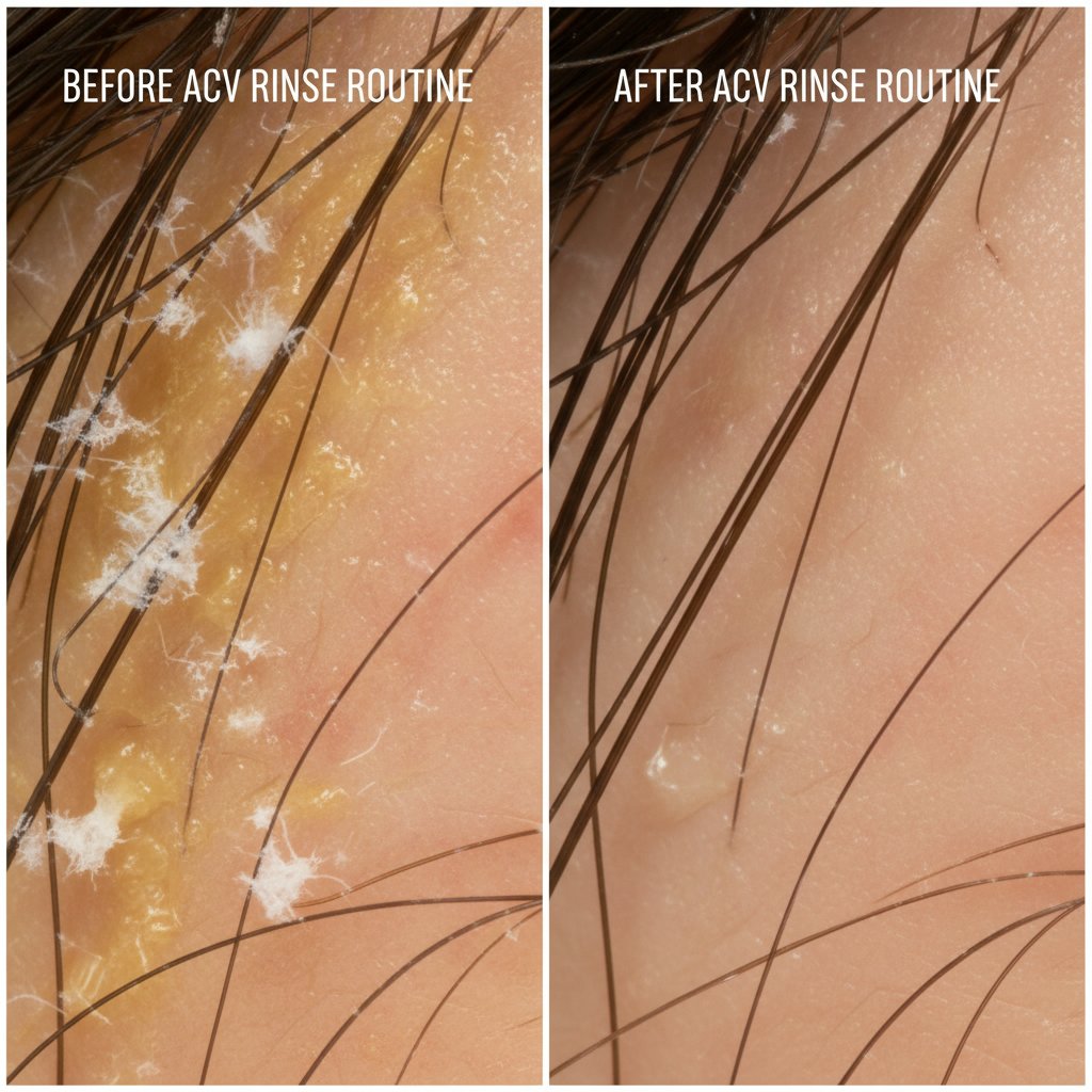 Before: Oily, dandruff-prone scalp. After: Clean, flake-free scalp from an ACV rinse routine.