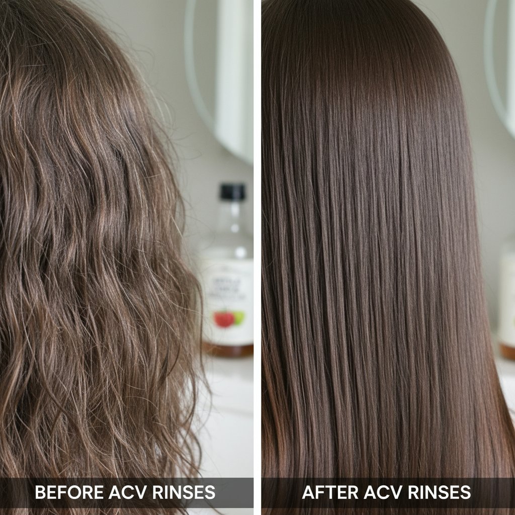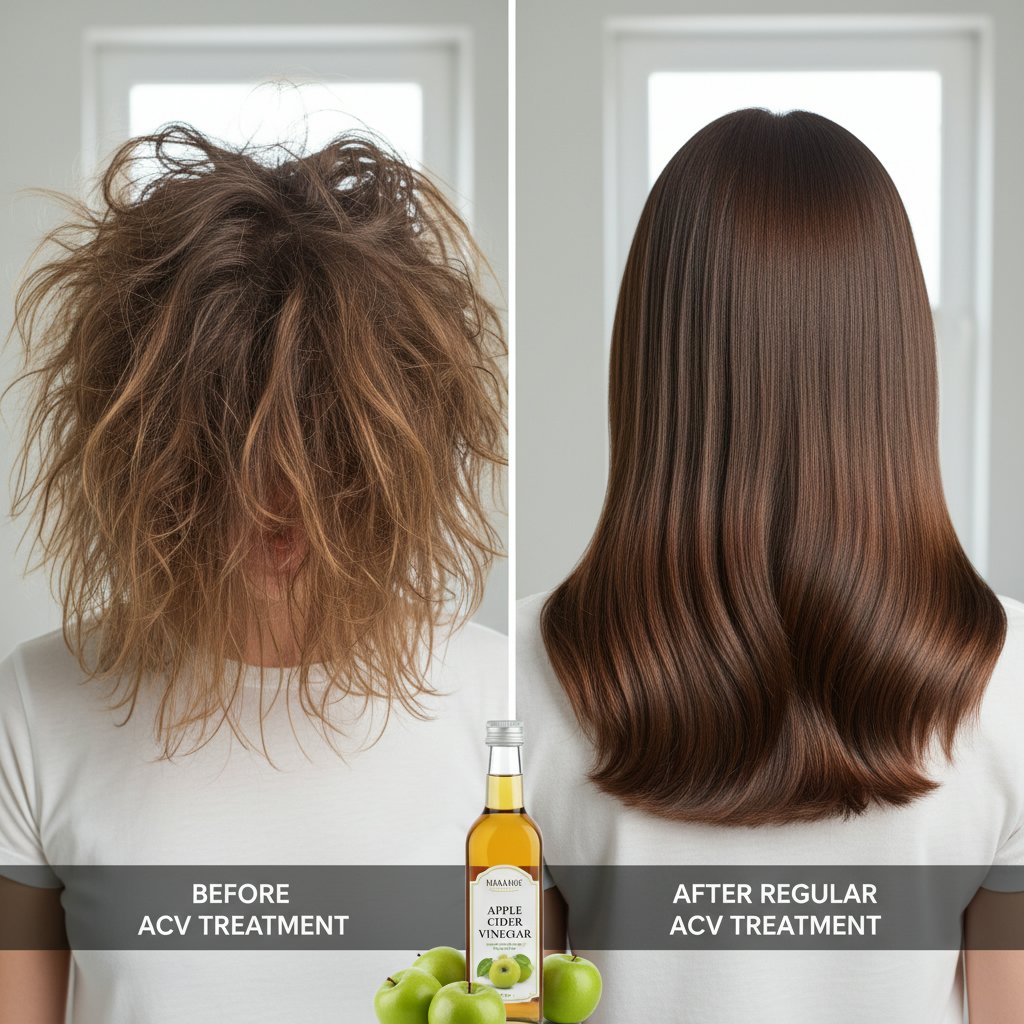 Before: Frizzy, unmanageable hair. After: Sleek, manageable strands from regular ACV treatment.