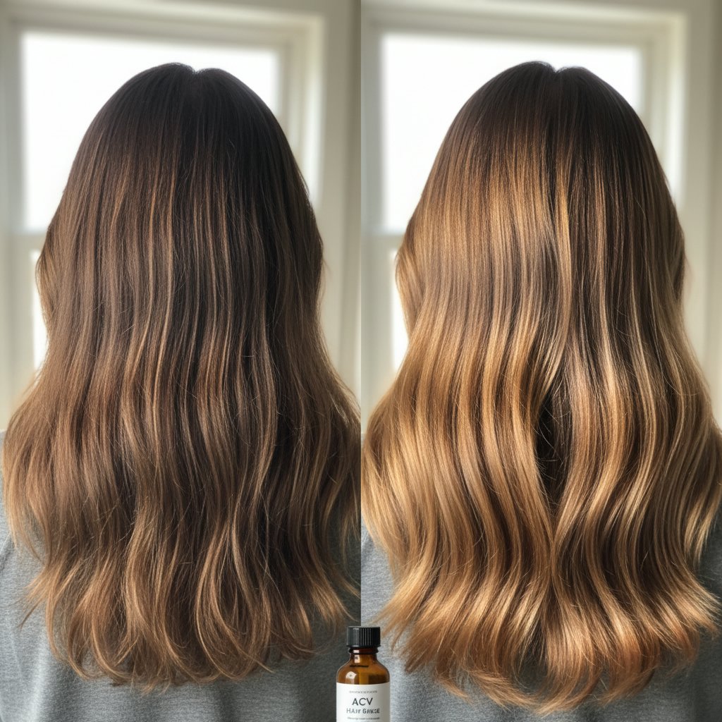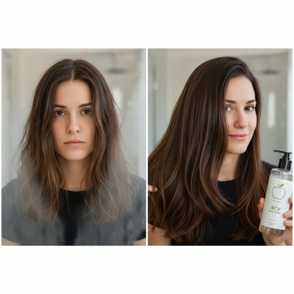 Before: Dull, lifeless hair. After: Radiant, shiny locks after incorporating ACV into hair washing.