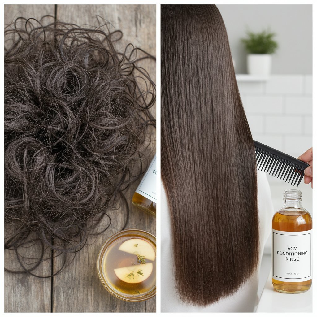 Before: Coarse, rough hair. After: Soft, silky hair texture achieved with regular ACV rinses.