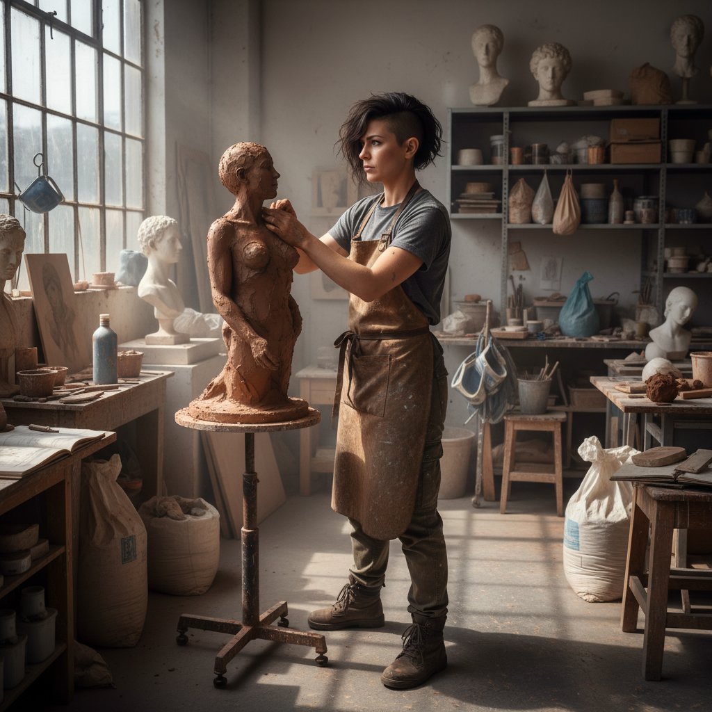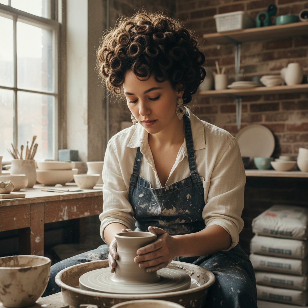 Sculpted curls, defined and voluminous, mirror the artistic hands that shape clay, showcasing the beauty of texture.