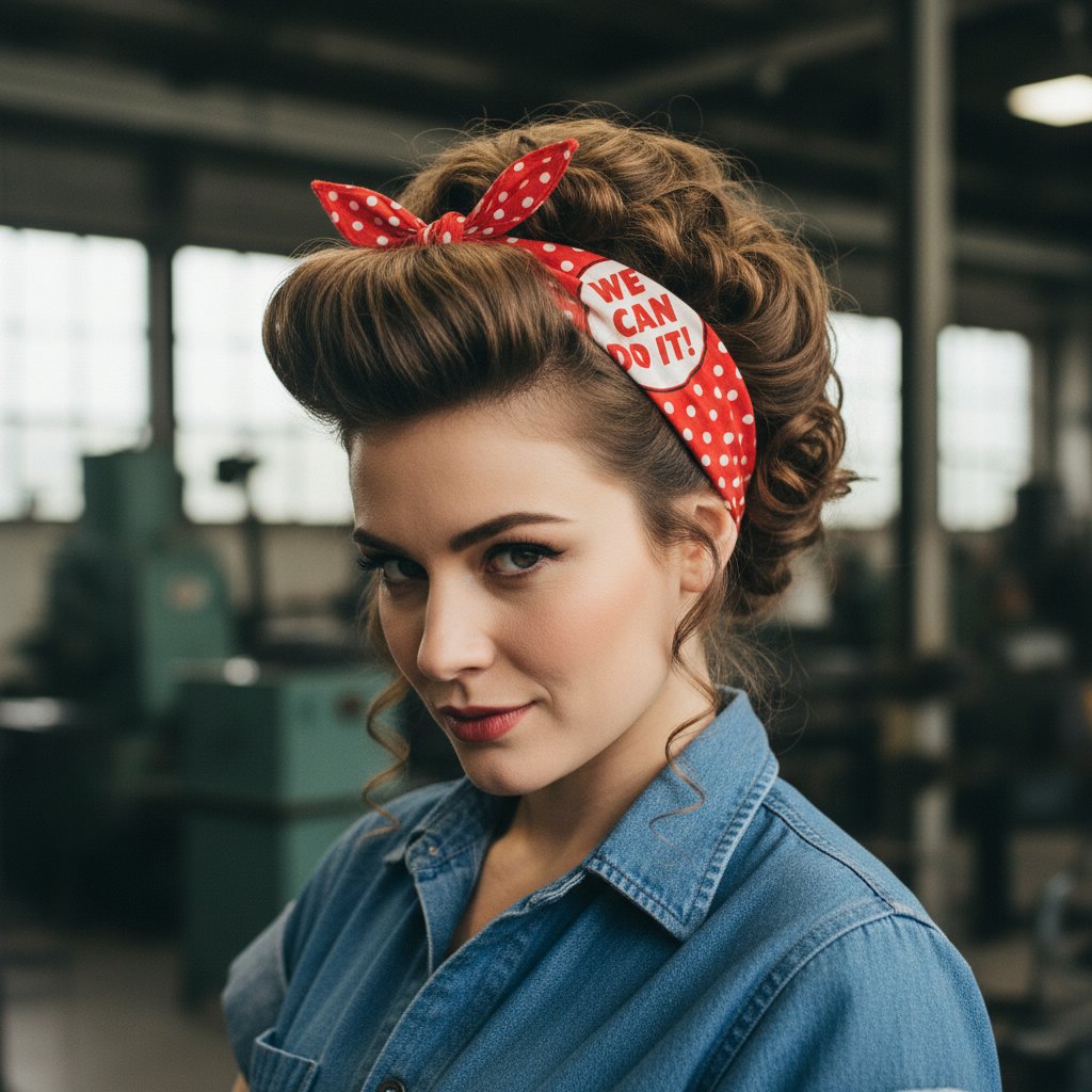 Channel the iconic Rosie the Riveter with a red bandana tied around a voluminous updo, epitomizing wartime chic.