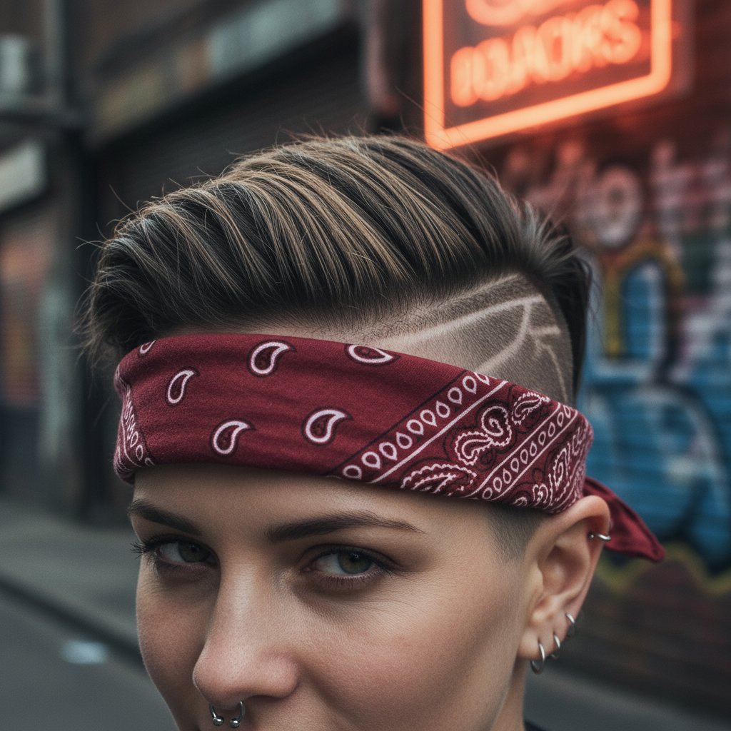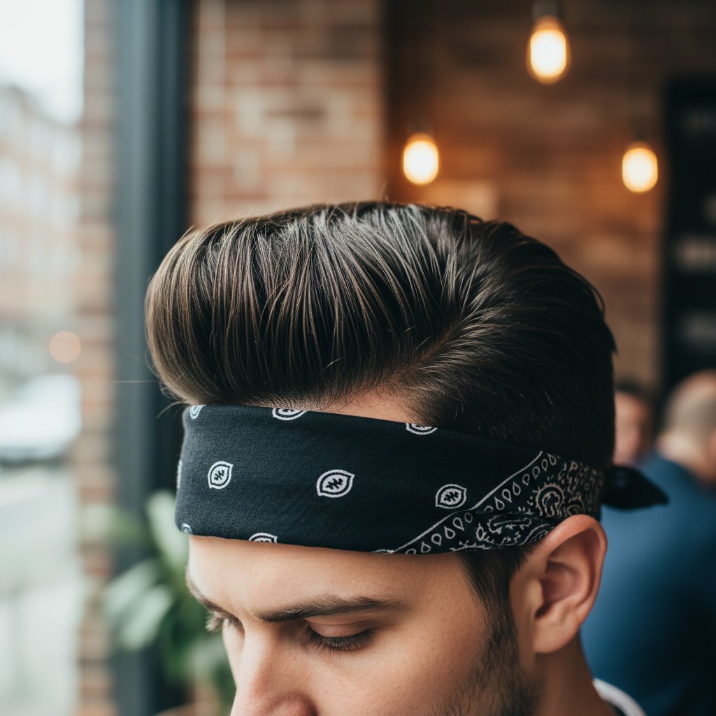 A sleek pompadour paired with a bandana headband creates a look that's both retro and edgy.