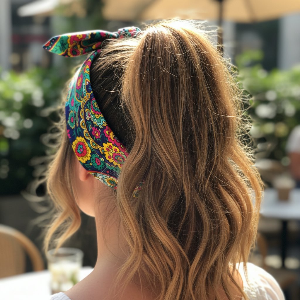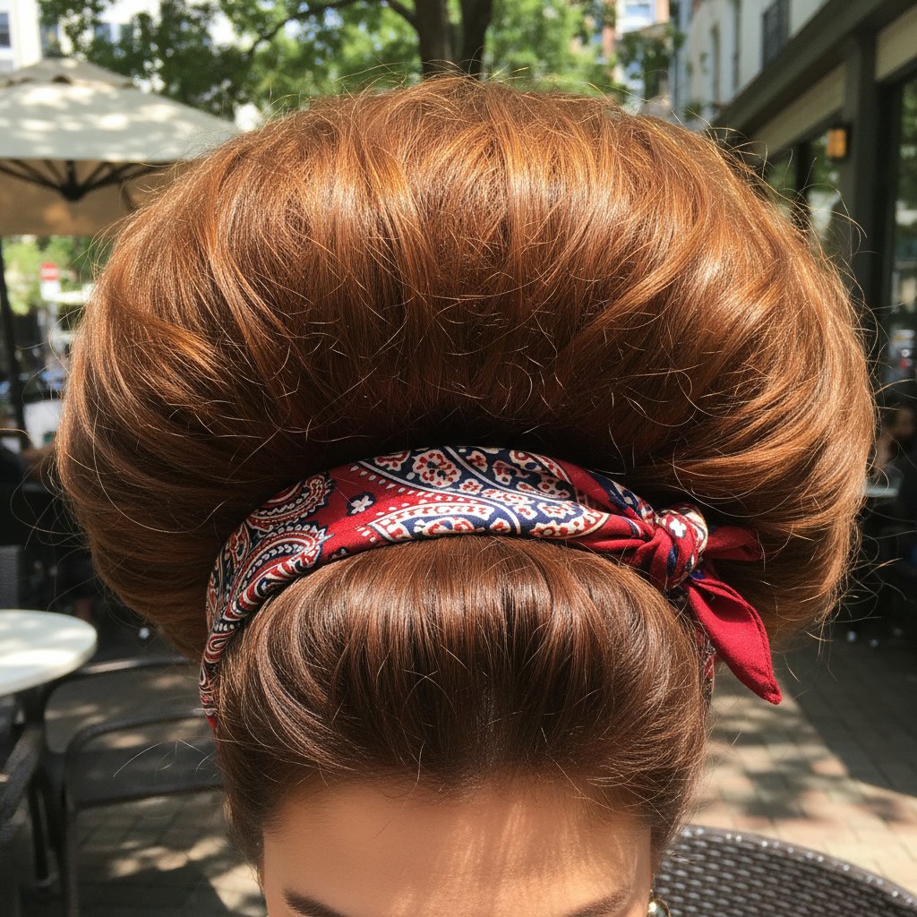 A voluminous bouffant with a bandana tied around it for a look that screams retro glamour.