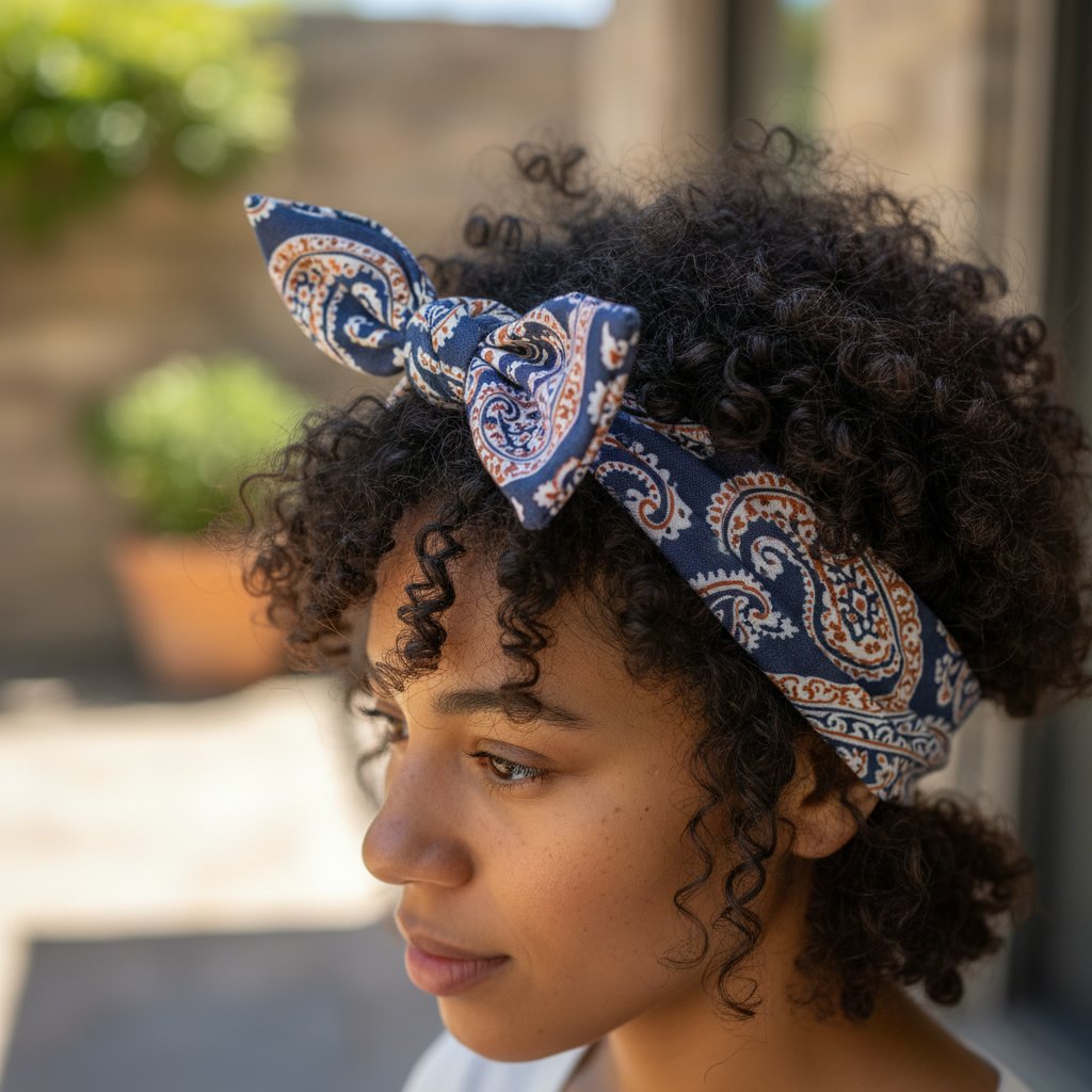 A bandana tied at the front in a bow adds a sweet, feminine touch to short, curled hair.