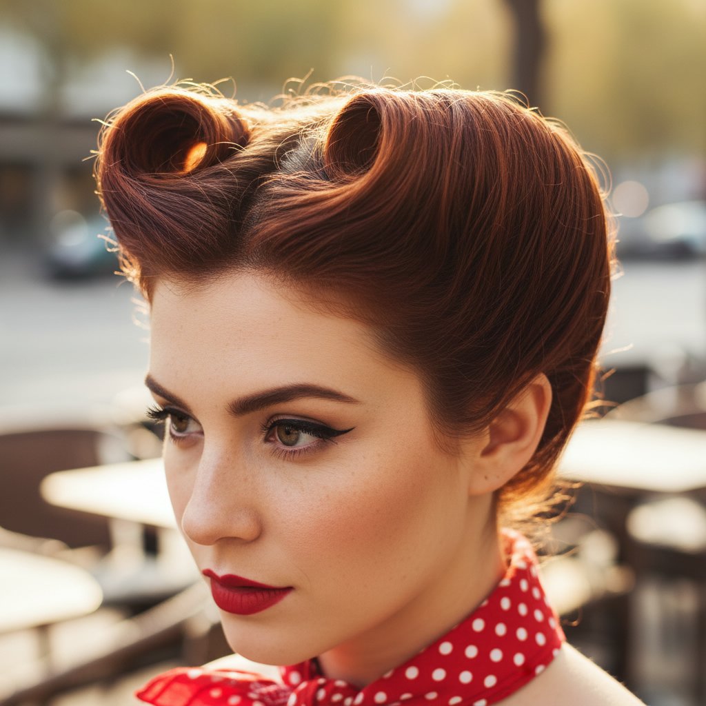 Victory rolls paired with a bandana tied at the back create a quintessential rockabilly look, merging style and history.