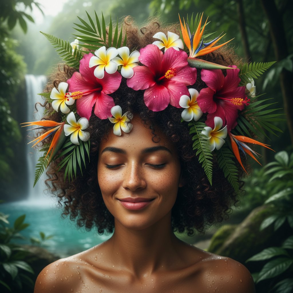 Show off your natural curls enhanced with tropical flower accents for a look that’s as vibrant as a beach sunset.