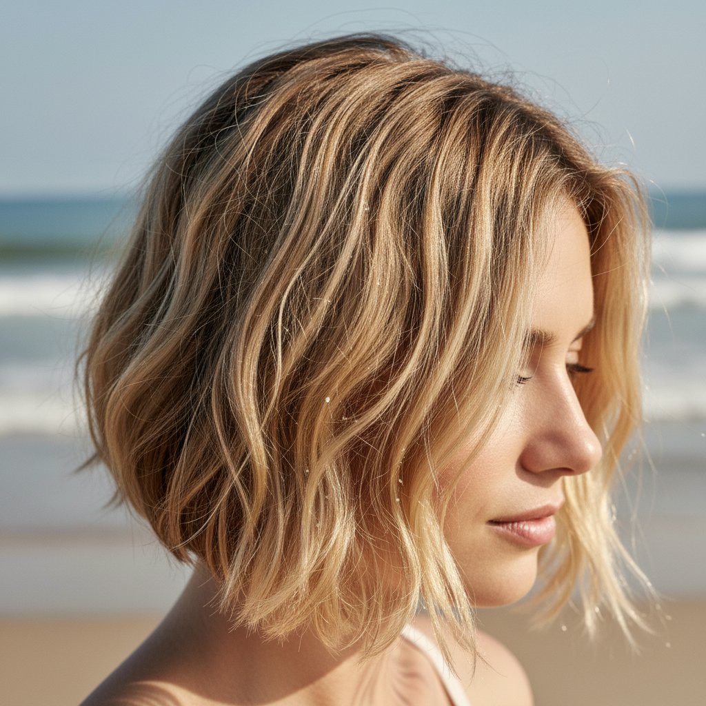 A short, textured bob with saltwater spritz brings a playful and easy-to-manage style for beach lovers.