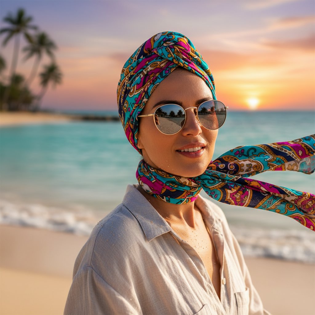 A colorful headscarf not only protects your hair from the sun but also adds a vibrant flair to your beach look.