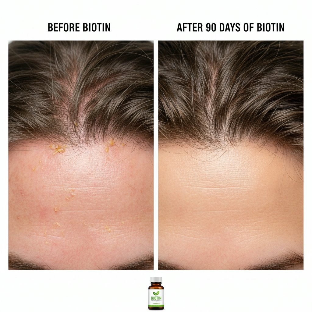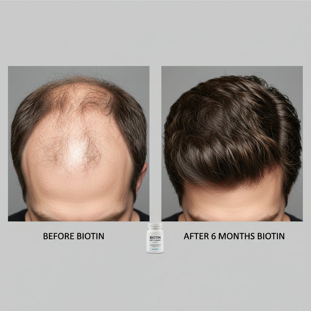 Before: Noticeable hair thinning. After: Significant hair growth and increased thickness after biotin supplementation.