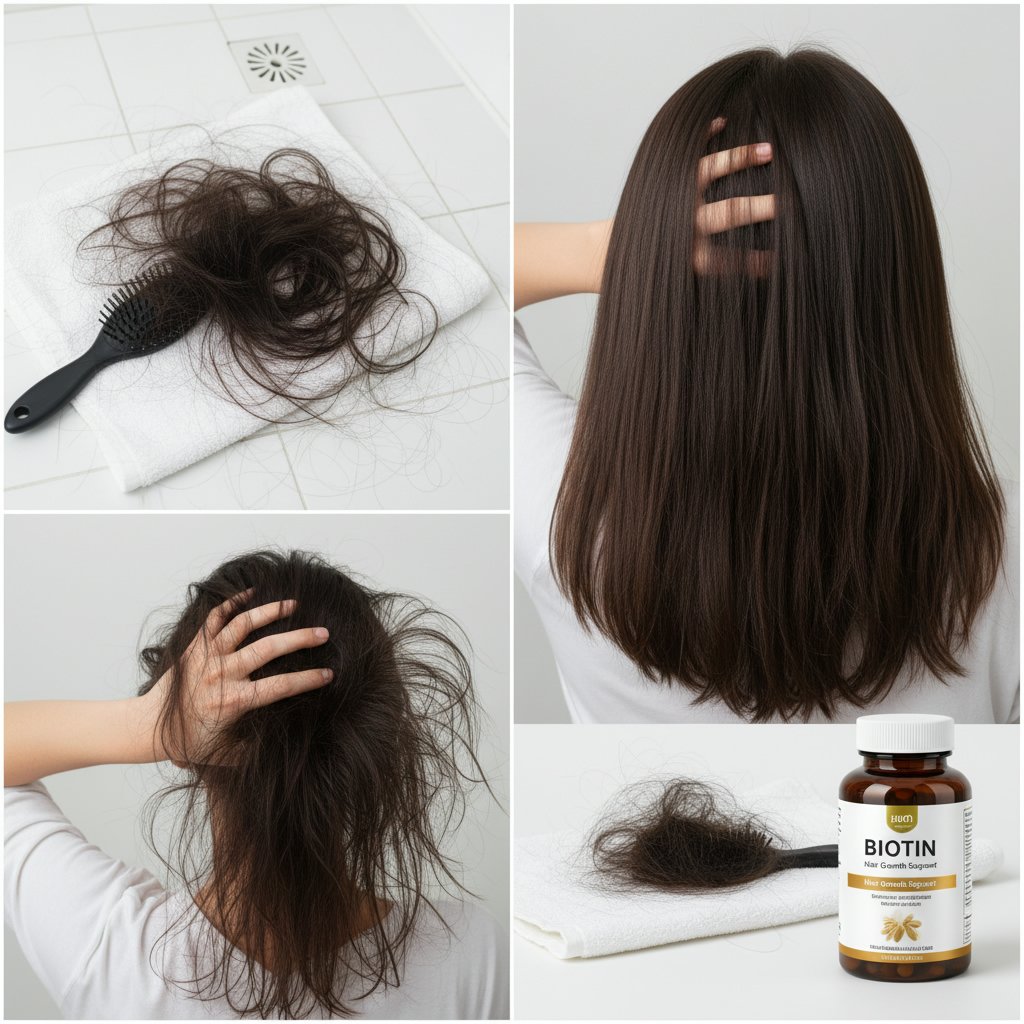 Before: Excessive hair shedding. After: Dramatic reduction in hair loss, demonstrating biotin's impact on hair retention.