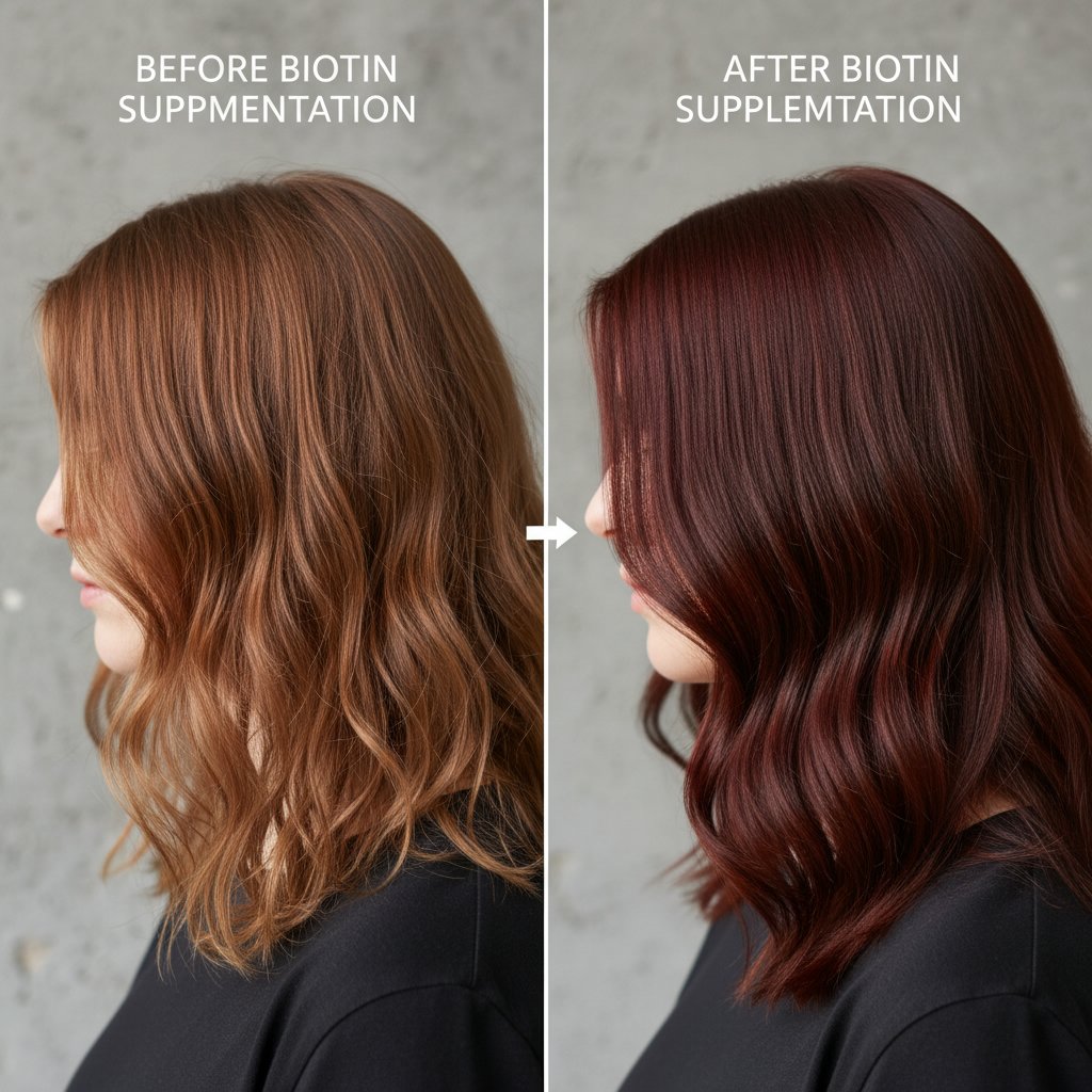 Before: Overall poor hair health. After: Comprehensive enhancement in hair health and appearance, credited to biotin.