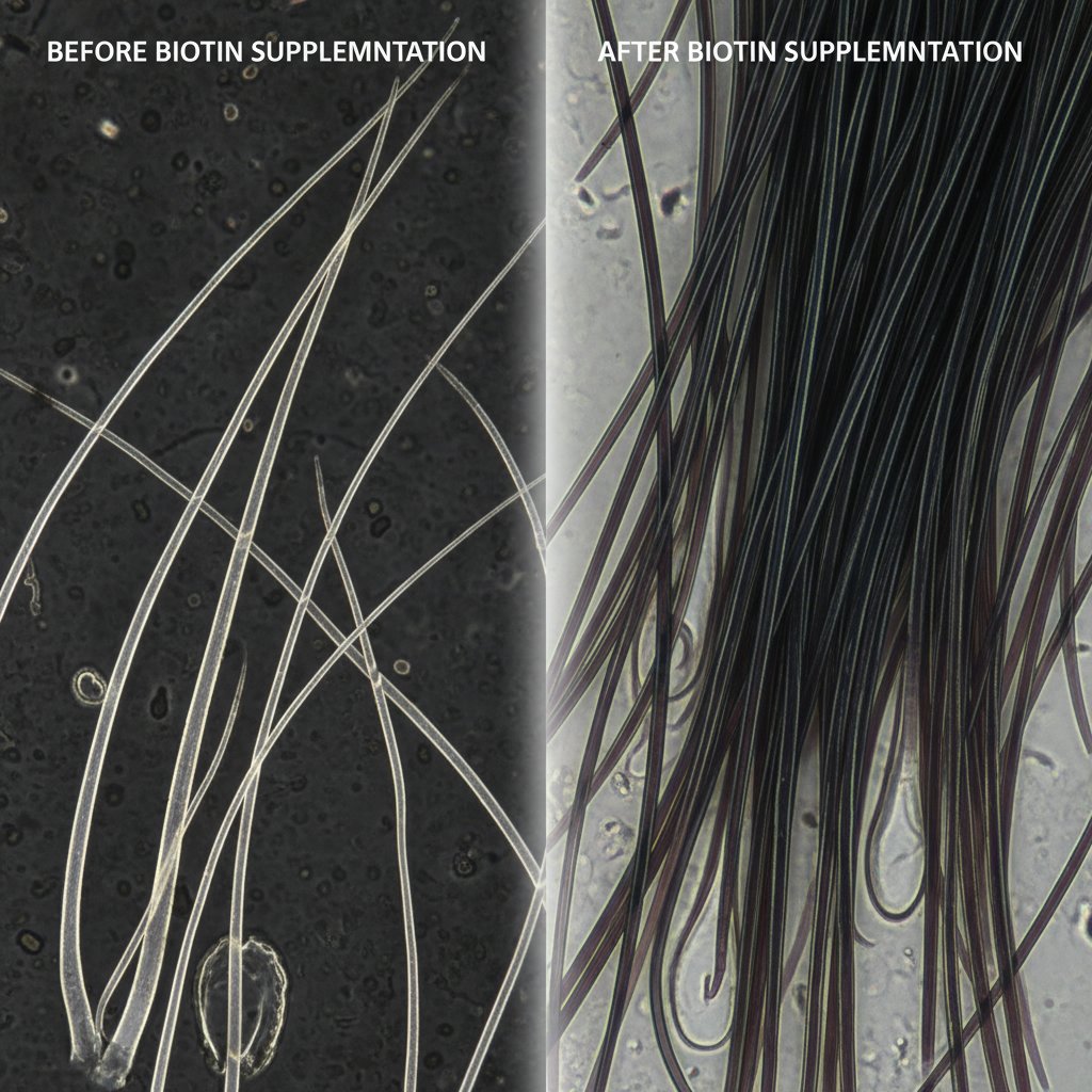 Before: Thin, weak hair strands. After: Thicker, more robust hair strands, a direct result of biotin's benefits.