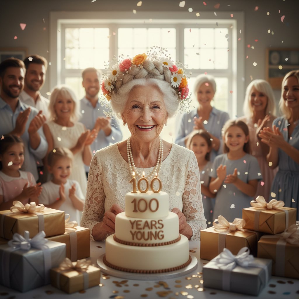 A crown of braids adorned with flowers, celebrating 100 years with a nod to timeless beauty and resilience.