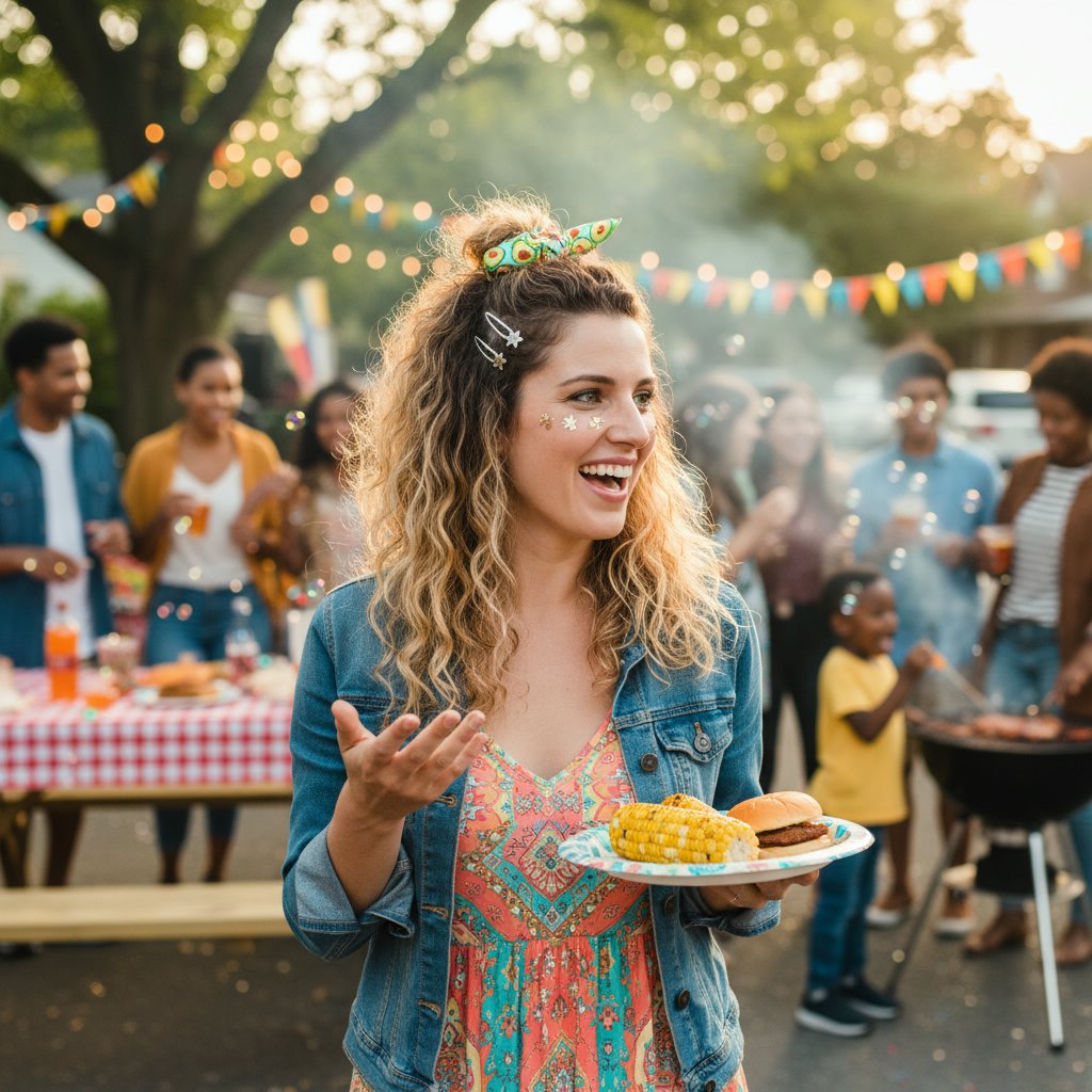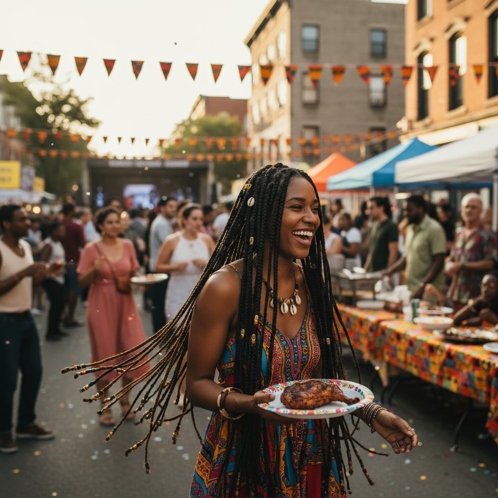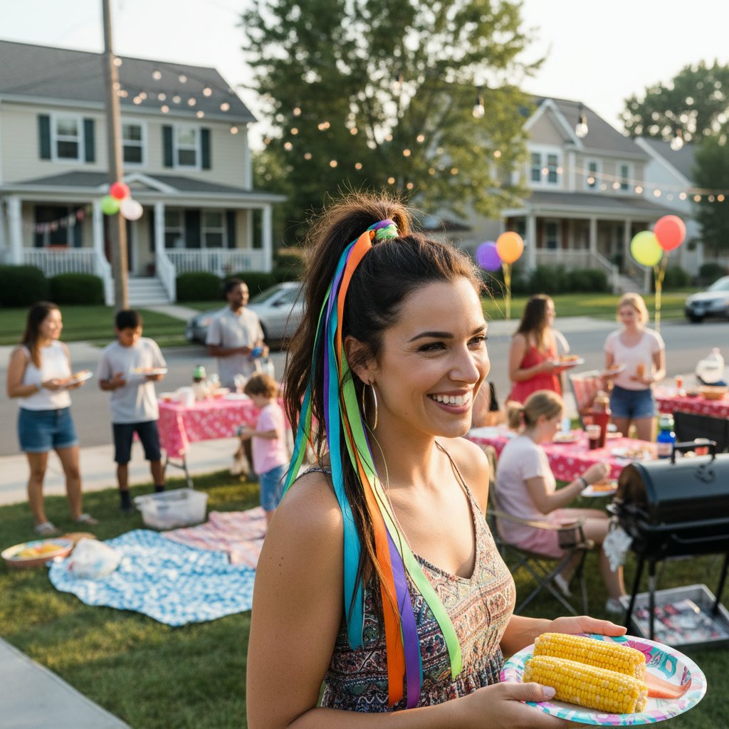 A high ponytail, adorned with colorful ribbons, captures the festive atmosphere of block parties, offering both style and comfort.