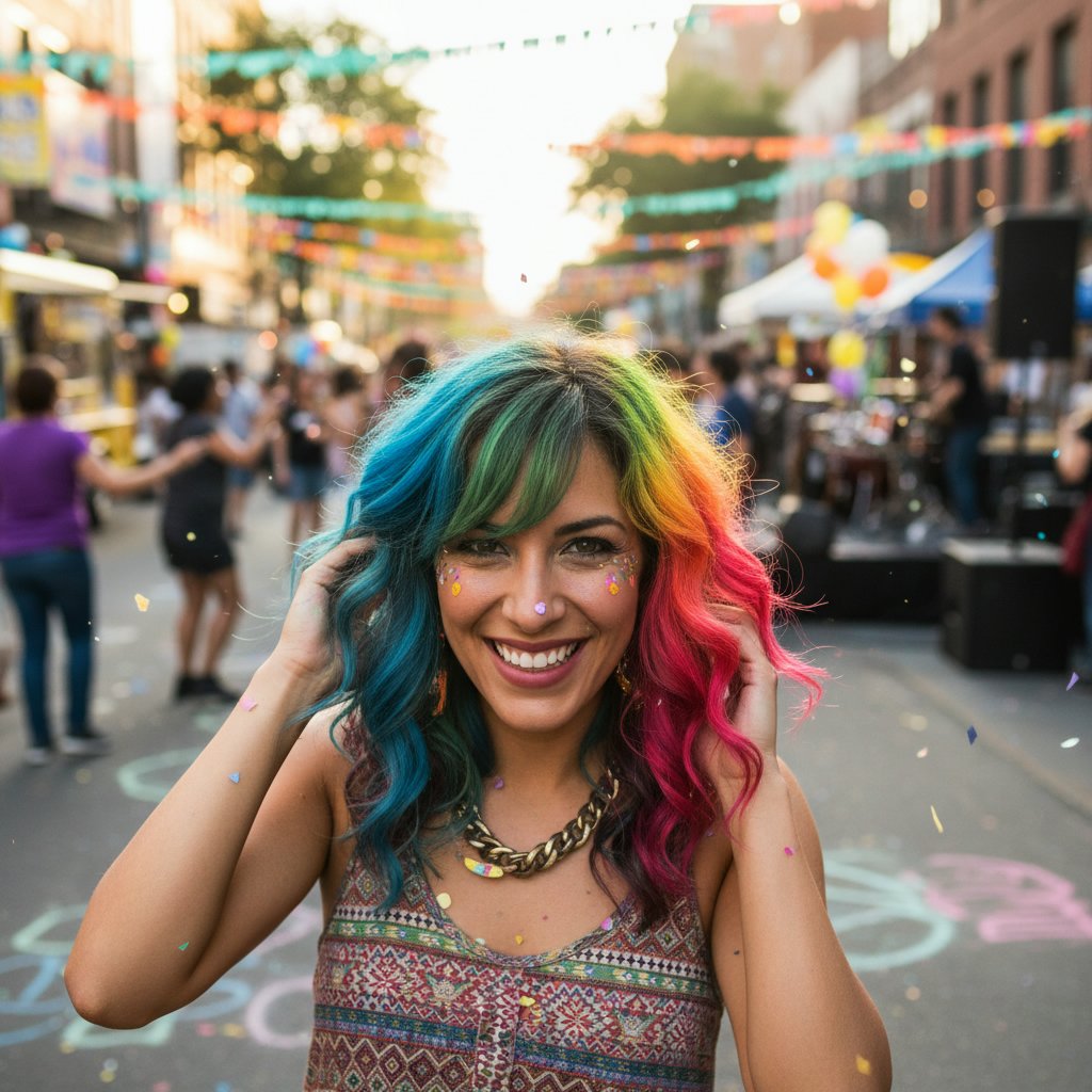 A half-up, half-down hairstyle adorned with fun accessories like mini flags or flowers celebrates the community spirit.
