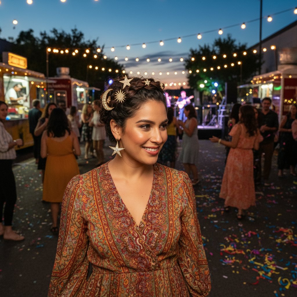 Statement hair pins not only keep your hair in place but also add a festive flair, reflecting the block party's joyful mood.