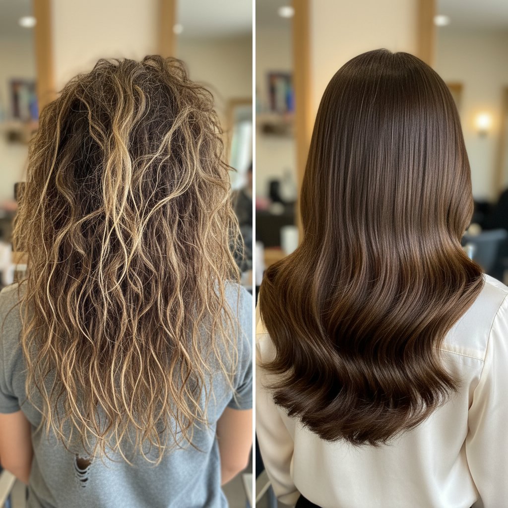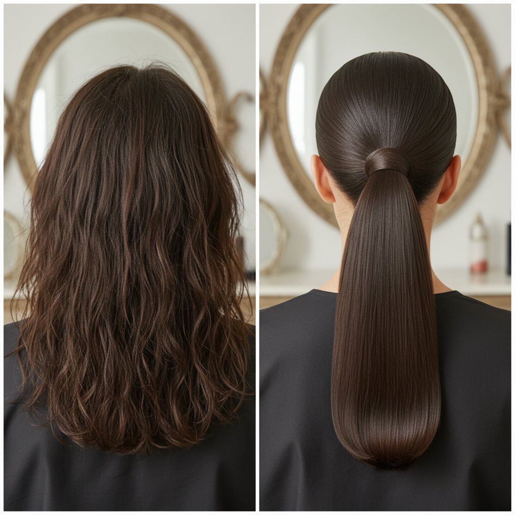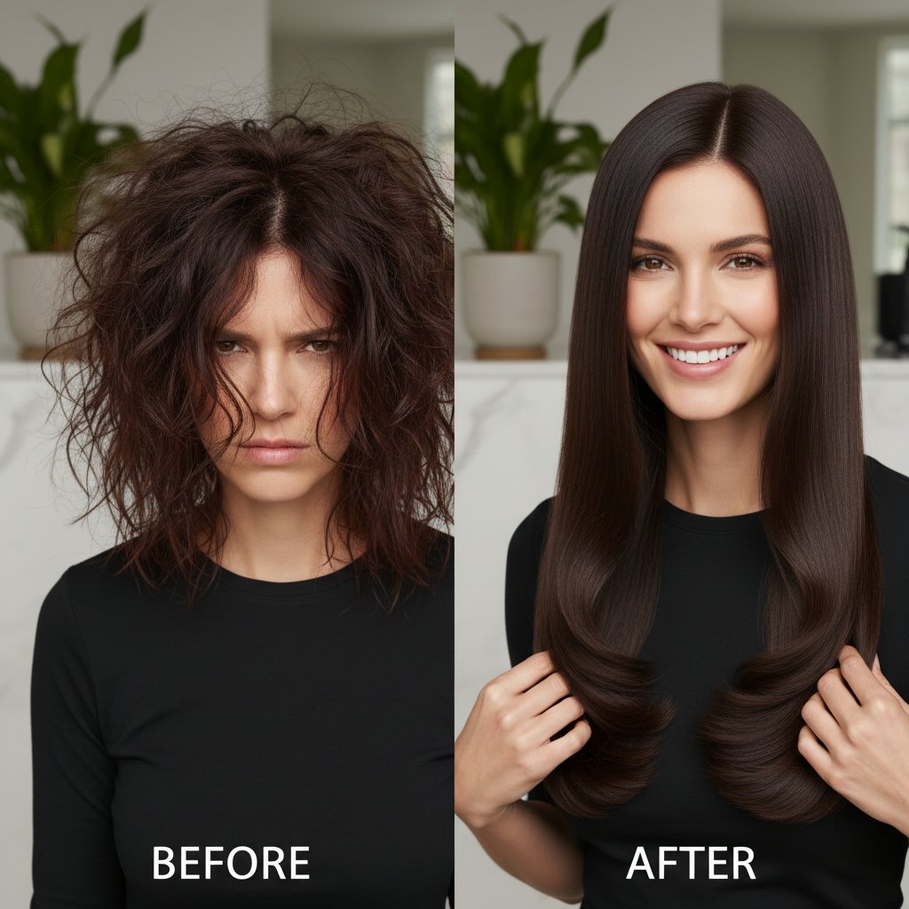Before: Frizzy, unmanageable hair. After: A silky smooth finish with a radiant shine, proving the smoothing power of a professional blowout.