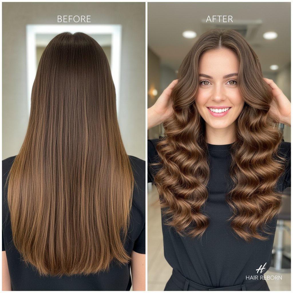 Before: Flat, lifeless hair. After: Voluminous waves that add both body and bounce, showcasing the blowout's ability to transform.