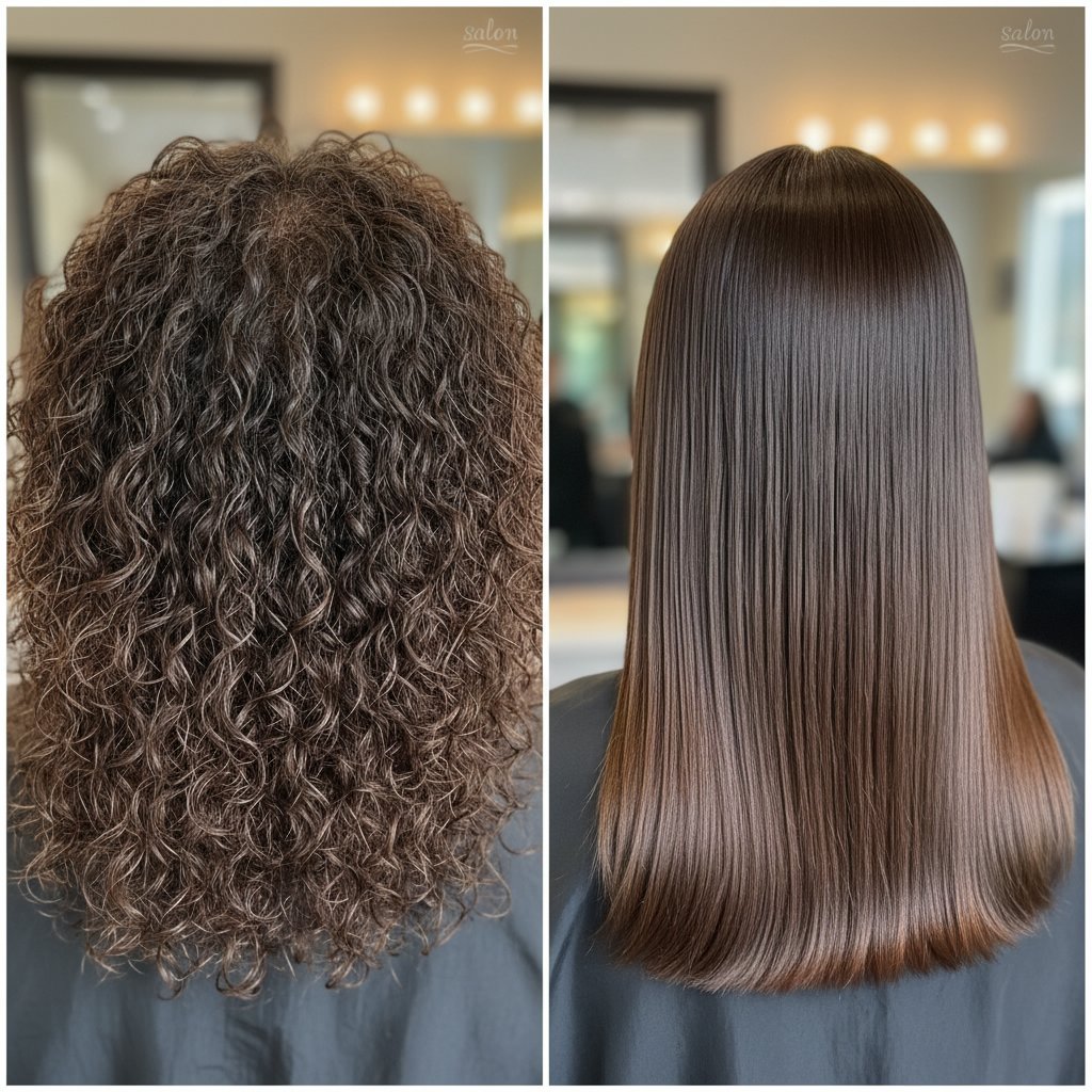 Before: Curly and coarse. After: Sleek, straight locks achieved with precision drying and styling, demonstrating the blowout's versatility.