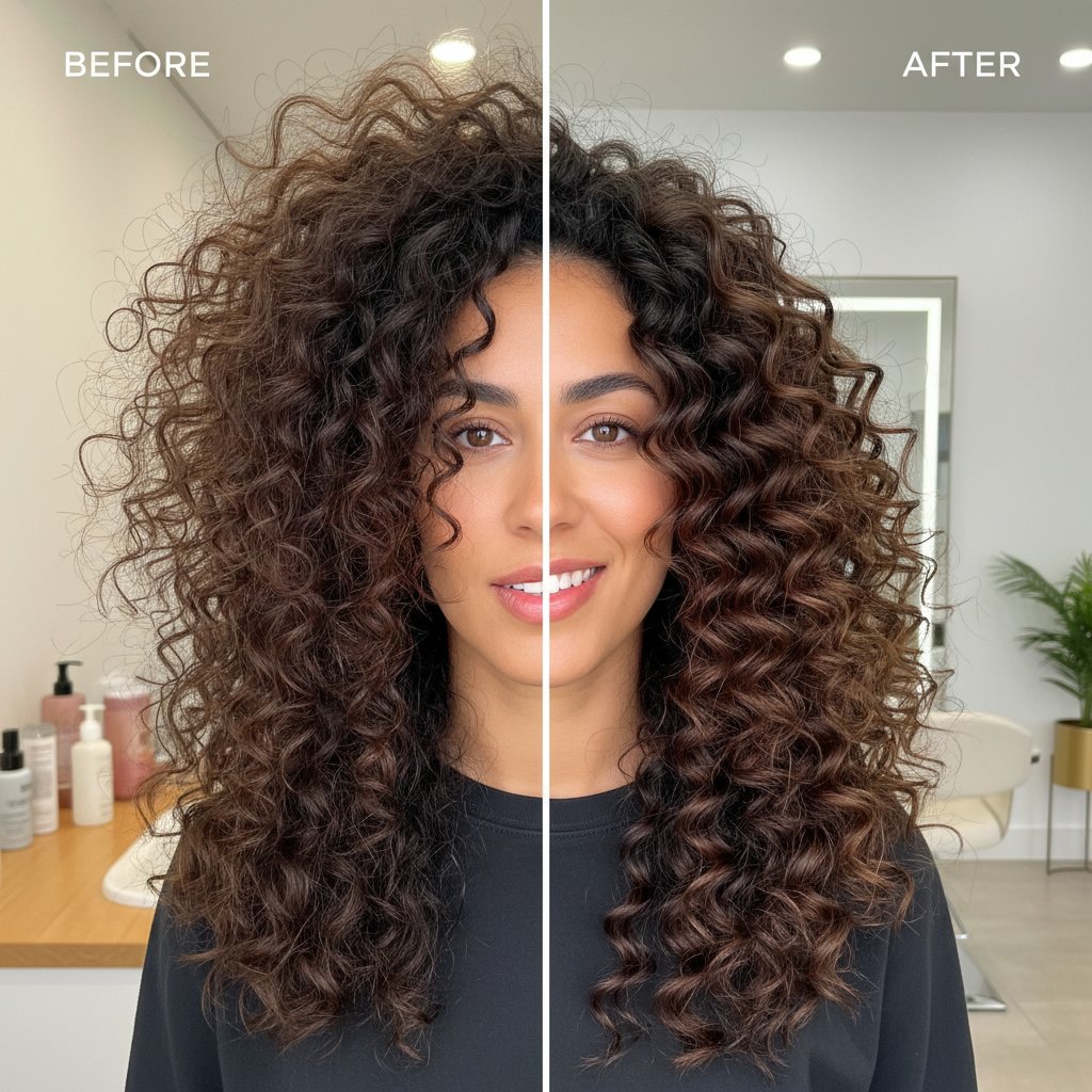 Before: Undefined, frizzy curls. After: Polished and defined curls, highlighting the blowout's ability to enhance natural texture.