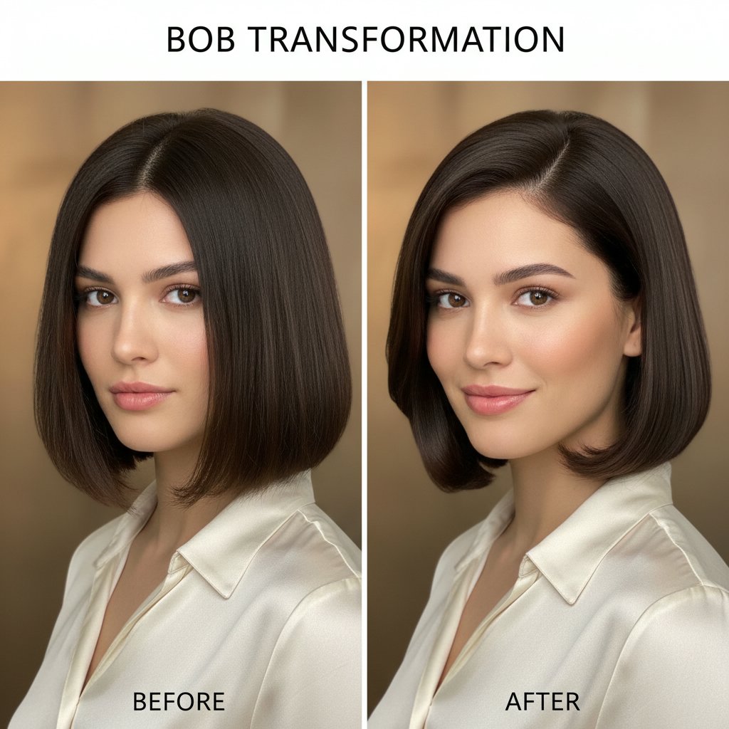 Before: Unstyled, blunt bob. After: A classic, chic bob with a smooth finish and rounded ends, courtesy of expert blowout techniques.