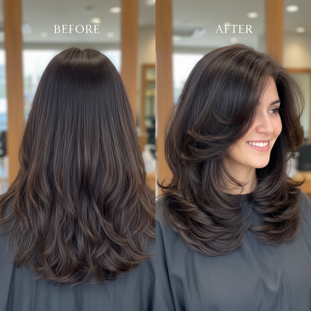 Before: Heavy, lifeless layers. After: Feathered, light layers that add dimension and movement, achieved with a strategic blowout.