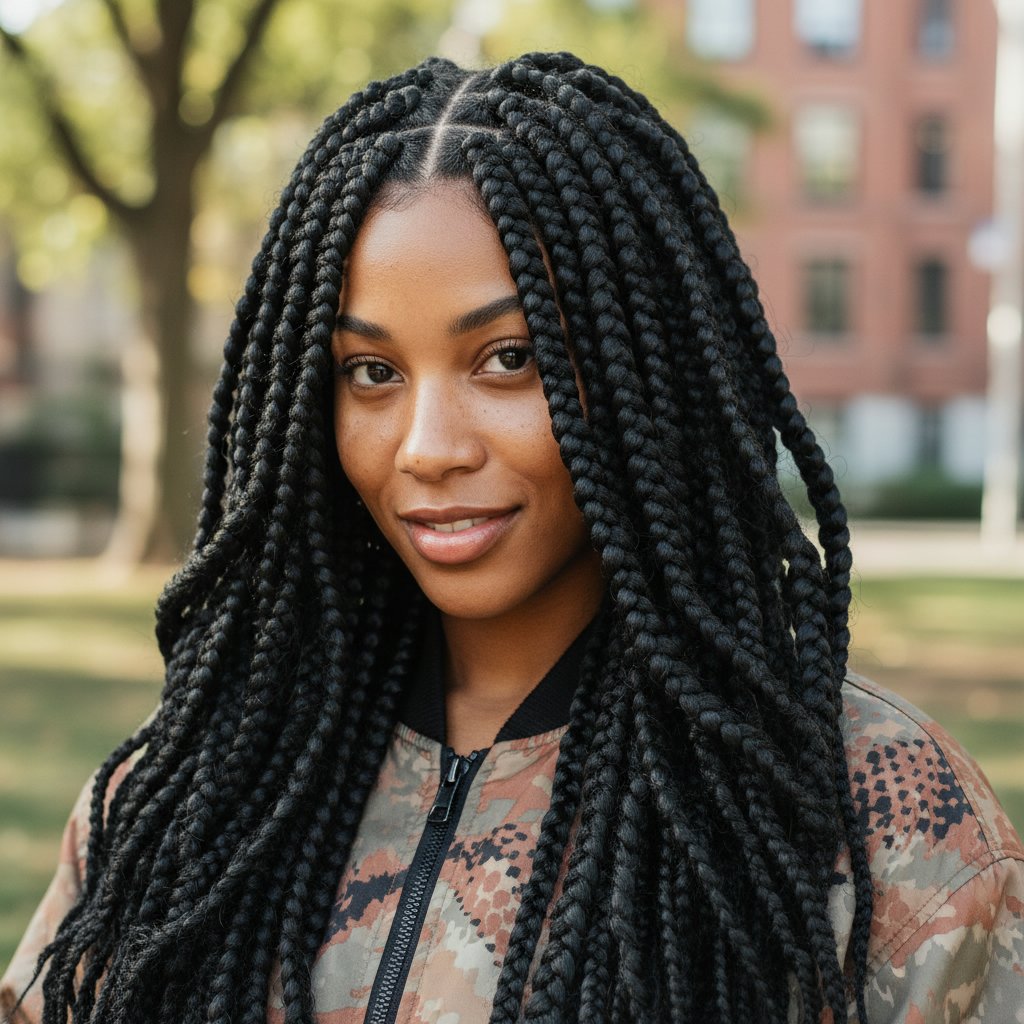 Classic mid-length box braids offer a timeless look, balancing ease of maintenance with versatile styling options.