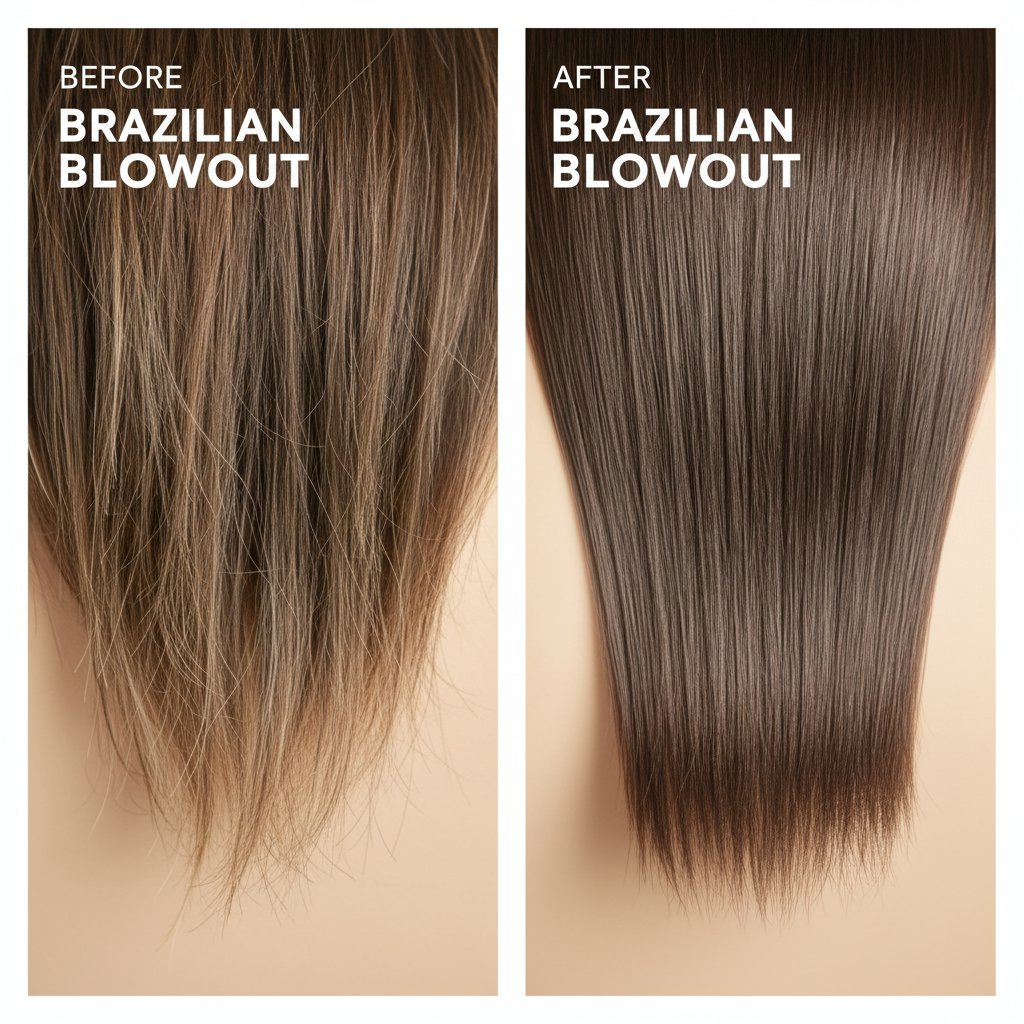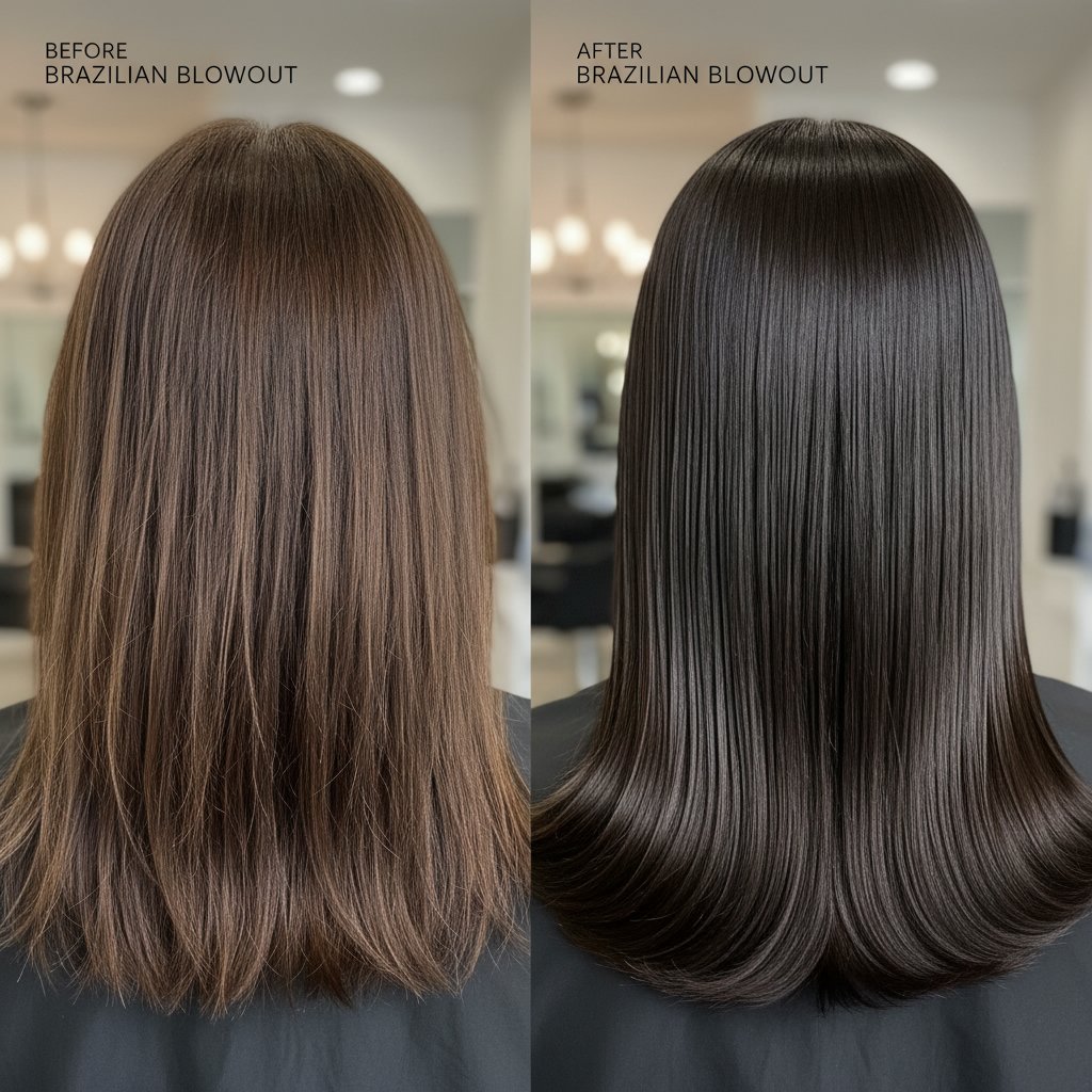 Before: Dull, lifeless hair. After: Lustrous, shiny locks post-Brazilian Blowout, highlighting the treatment's shine enhancement.