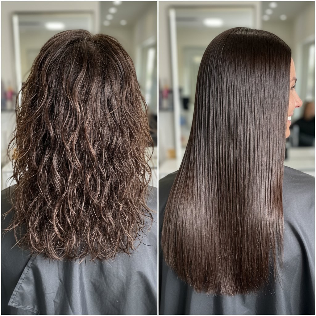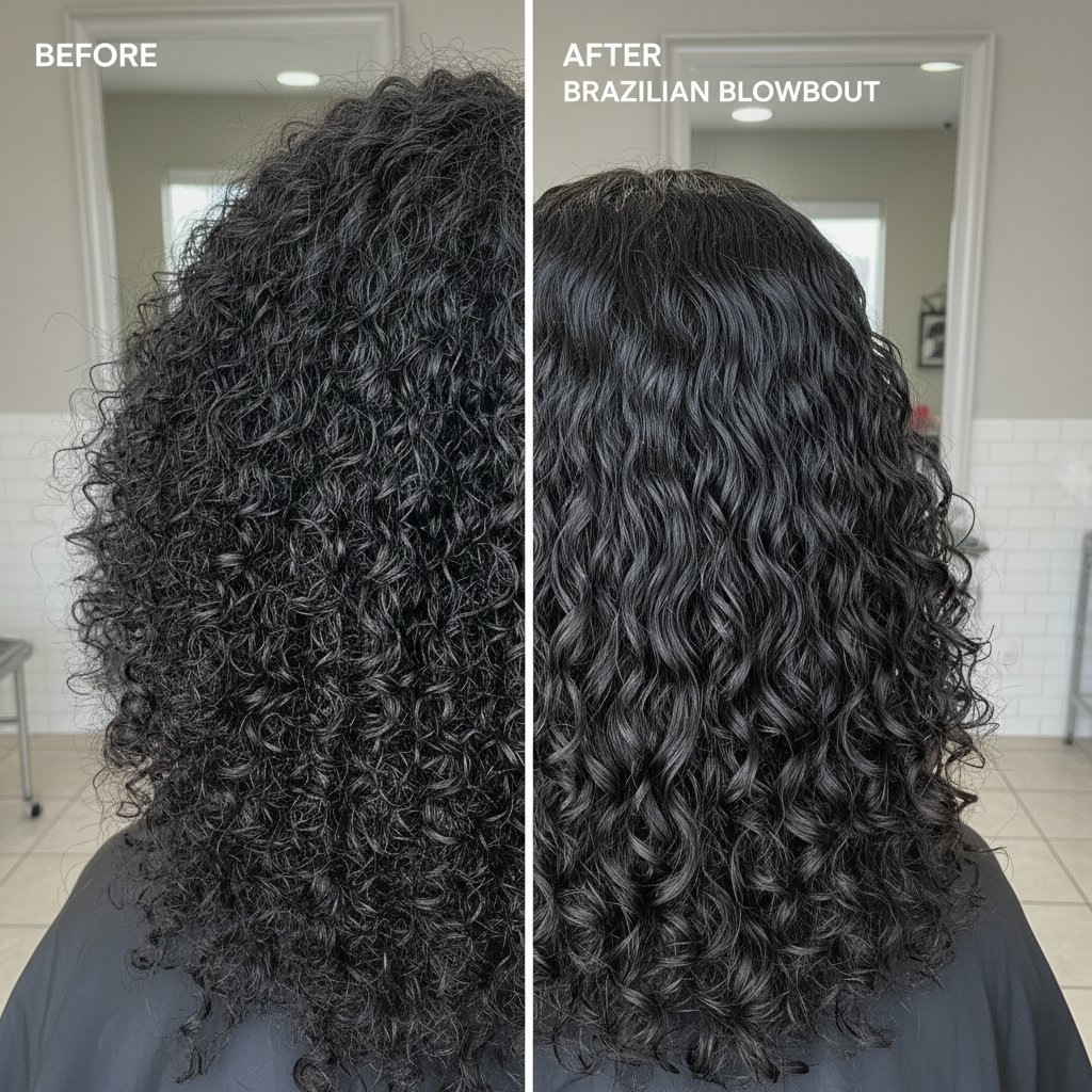 Before: Tight, unmanageable curls. After: Smooth, sleek strands with a Brazilian Blowout, showcasing remarkable frizz control.