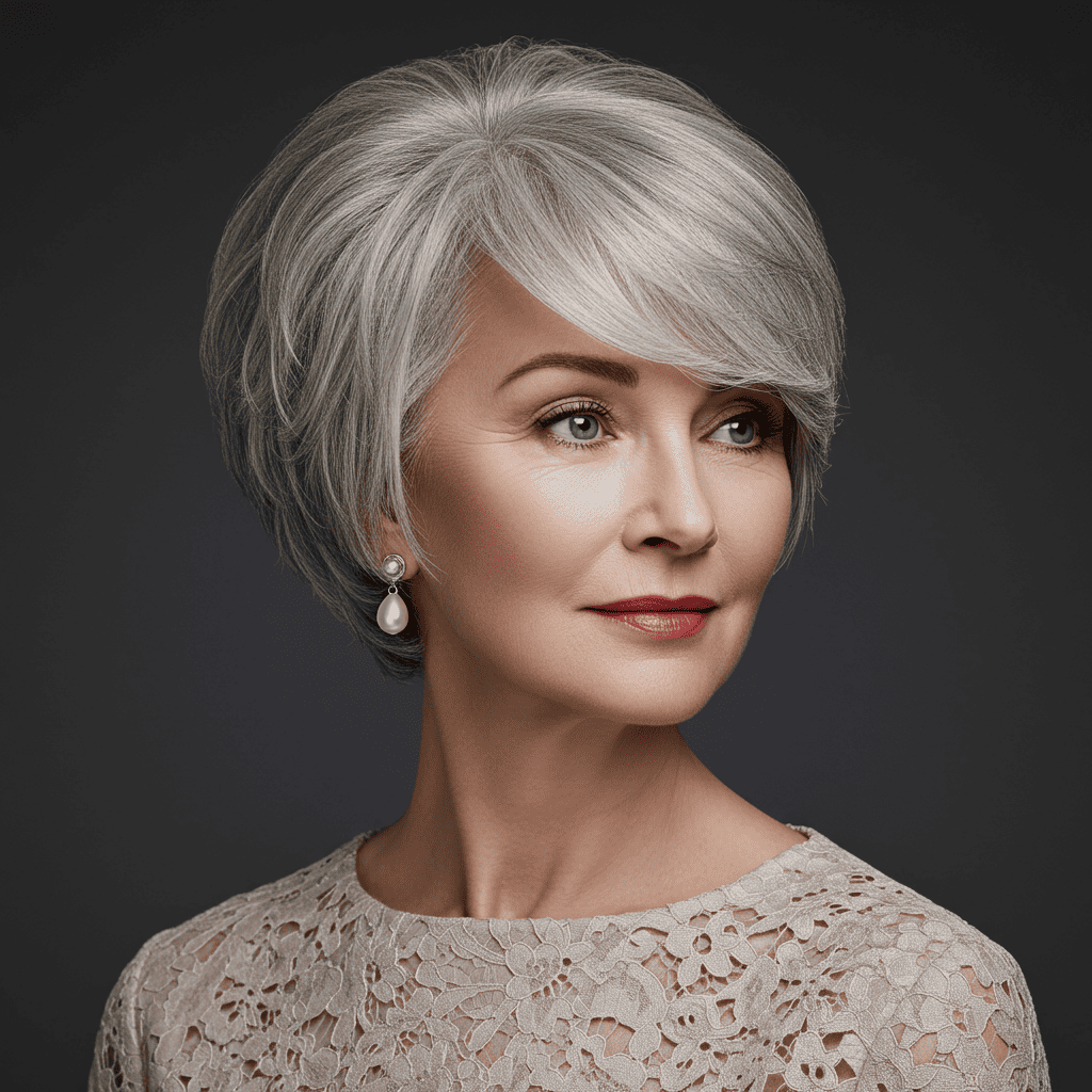 Butterfly cut on mature grey hair demonstrating how the style adds youthful movement and volume while maintaining sophistication.