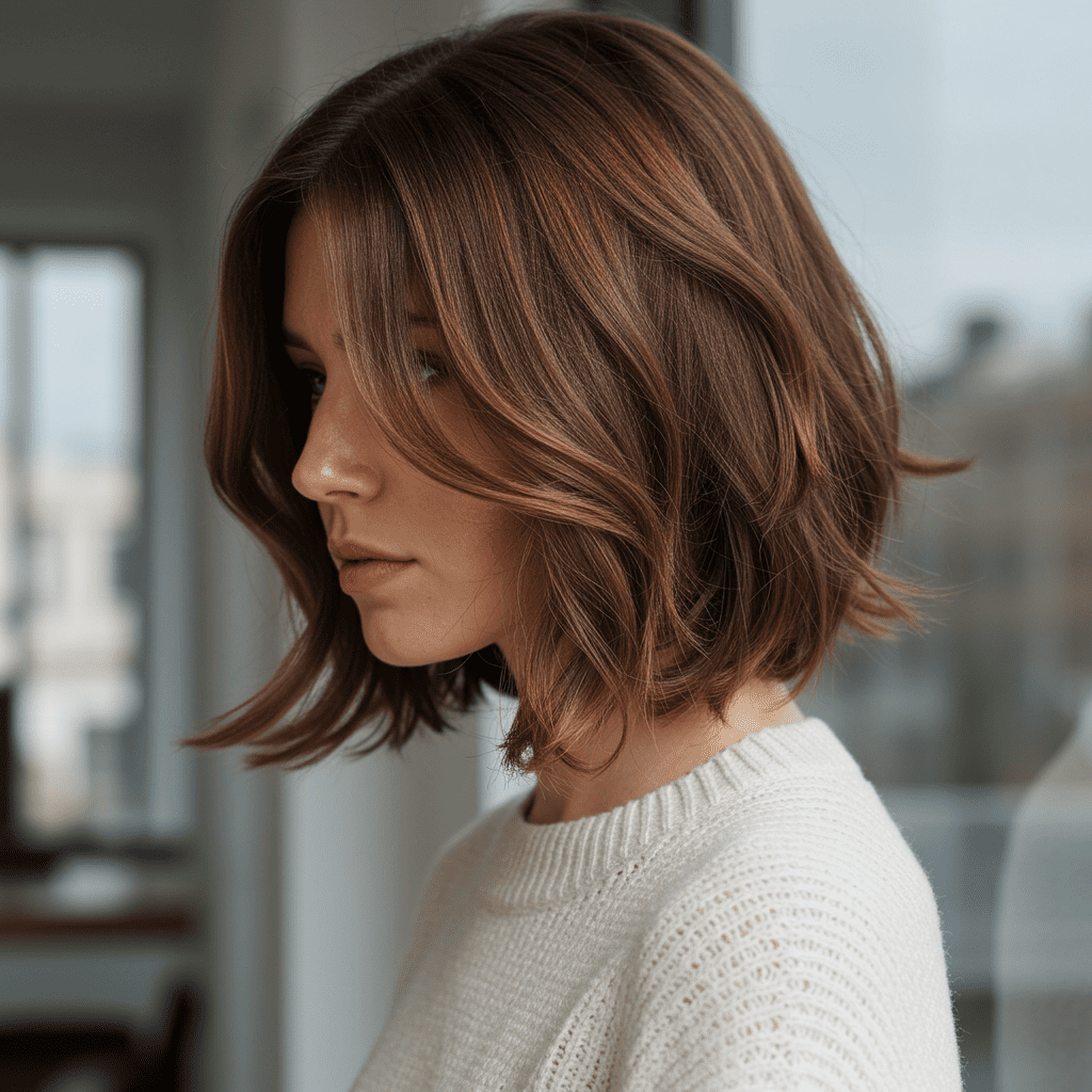 Bob-length butterfly cut creating a modern take on the classic 70s Farrah Fawcett style with updated, softer feathering.