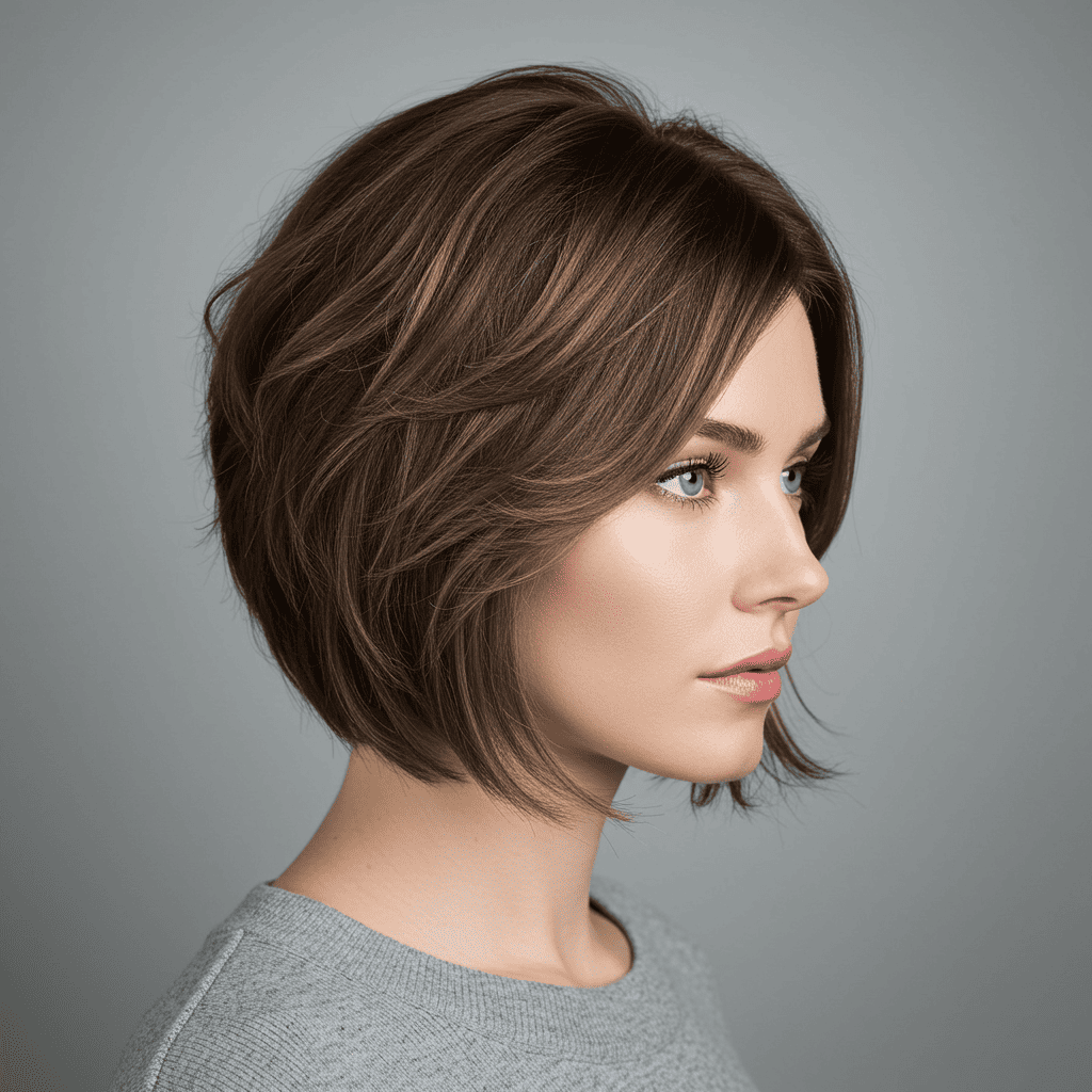 Classic short butterfly cut showcasing the signature feathered layers that create movement and volume, perfect for fine hair seeking body and dimension.