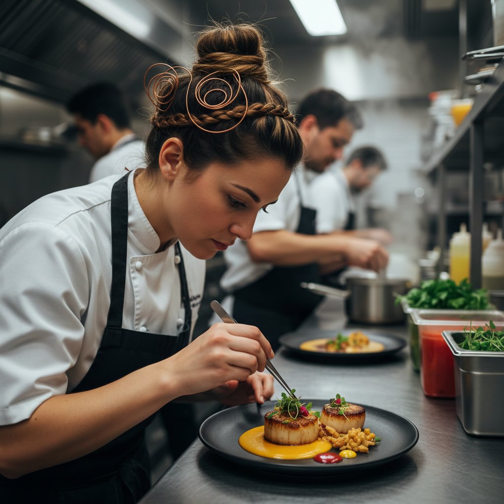 Hair pulled back with a twist combines functionality with a creative flair, ideal for chefs who bring artistry to their cuisine.