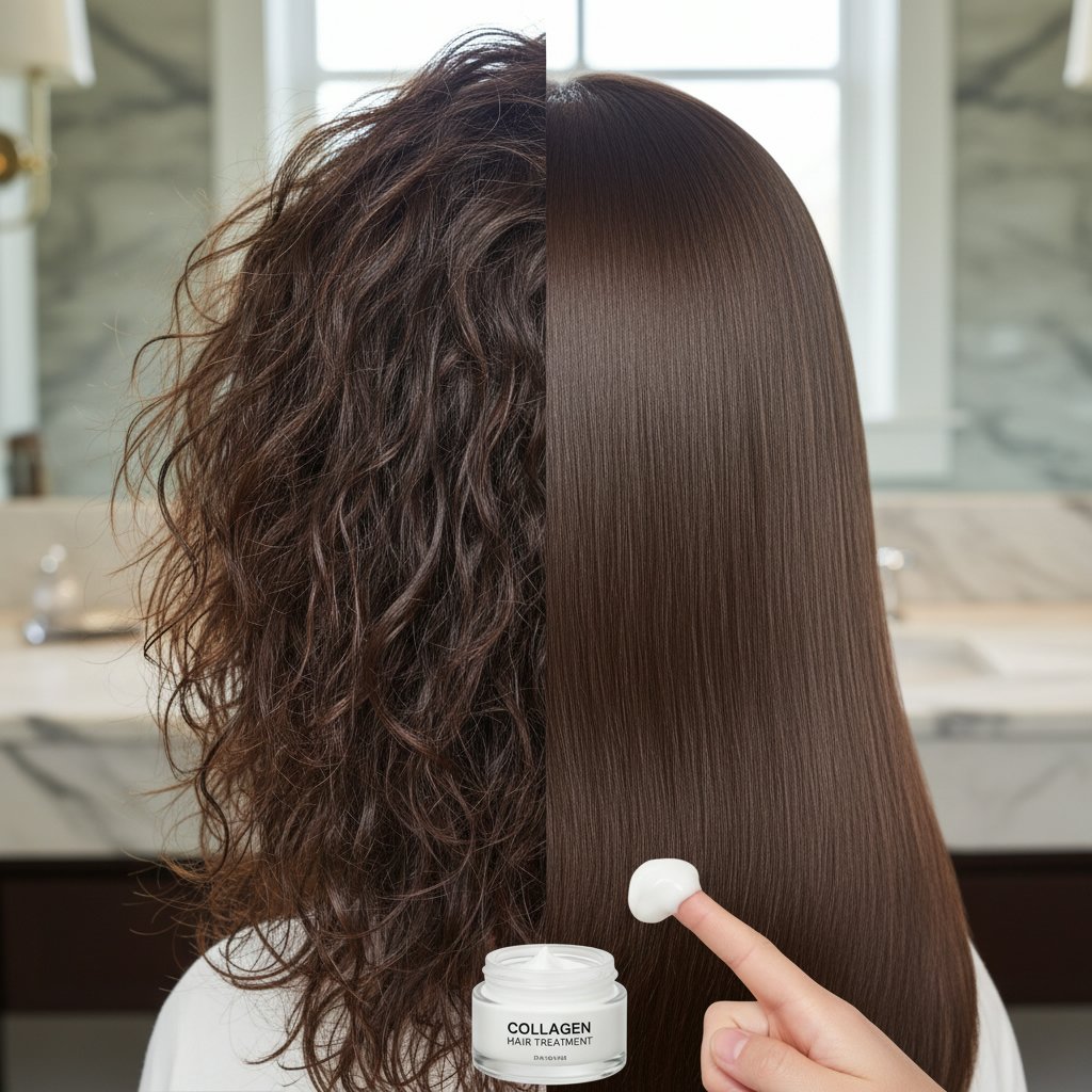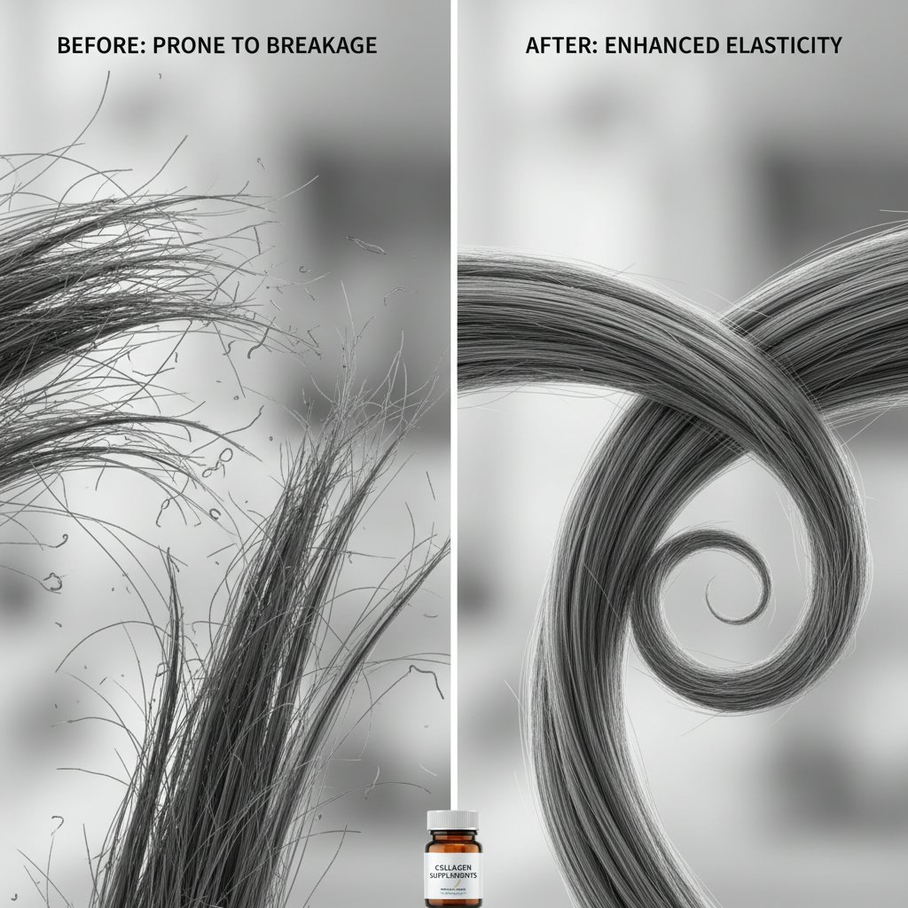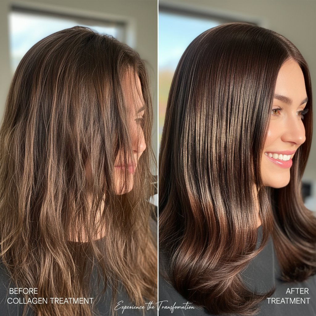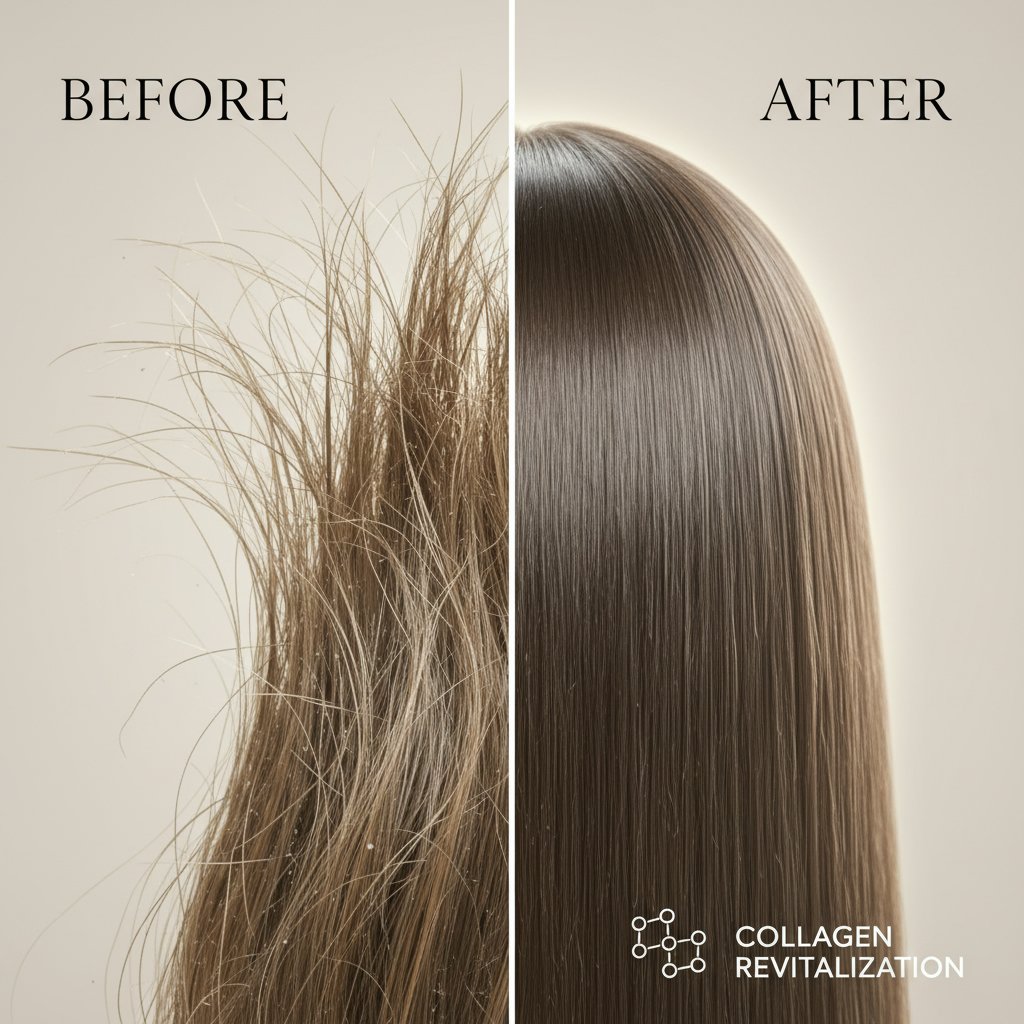 Before: Weak, brittle strands. After: Revitalized hair structure with visibly stronger strands from collagen treatments.