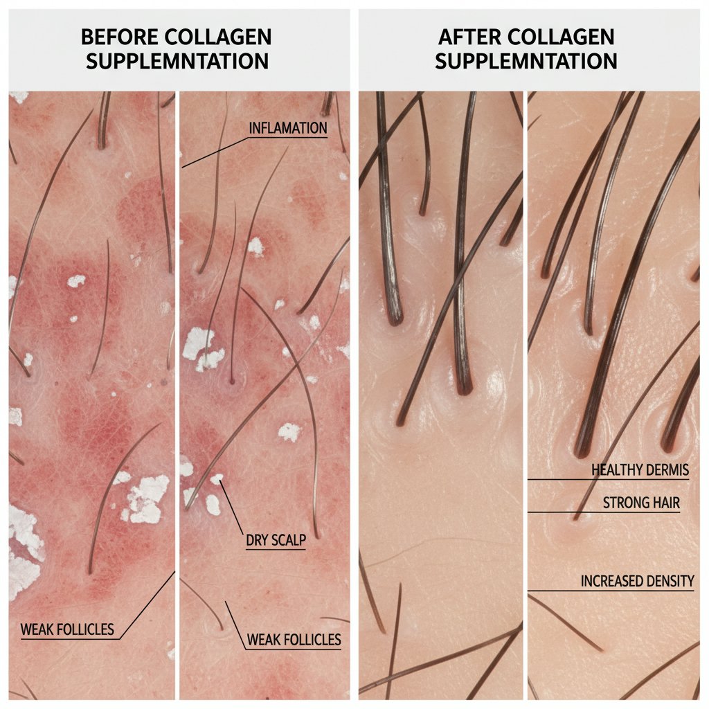 Before: Problematic scalp conditions. After: Improved scalp health, fostering a better environment for hair growth with collagen.