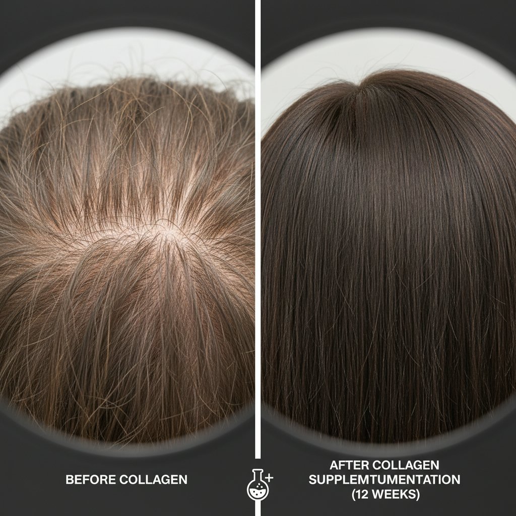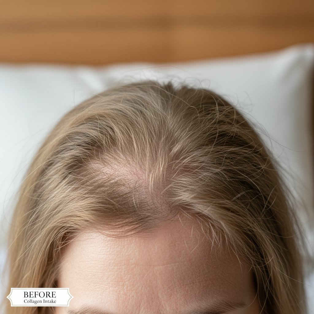 Before: Thinning hair. After: Noticeable restoration of hair thickness and volume attributed to collagen intake.