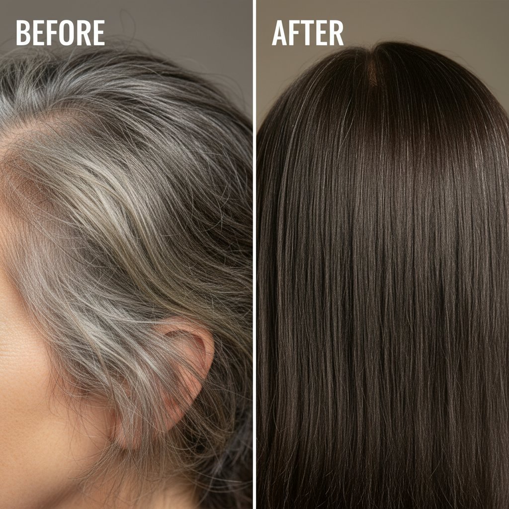 Before: Aging, graying hair. After: Rejuvenated hair appearance, looking younger and healthier with collagen.