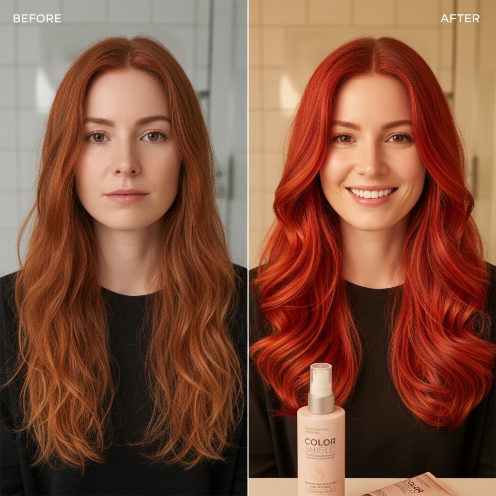 Before: Faded, lifeless red. After: Radiant, fiery red hues restored, thanks to specialized color-safe treatments.