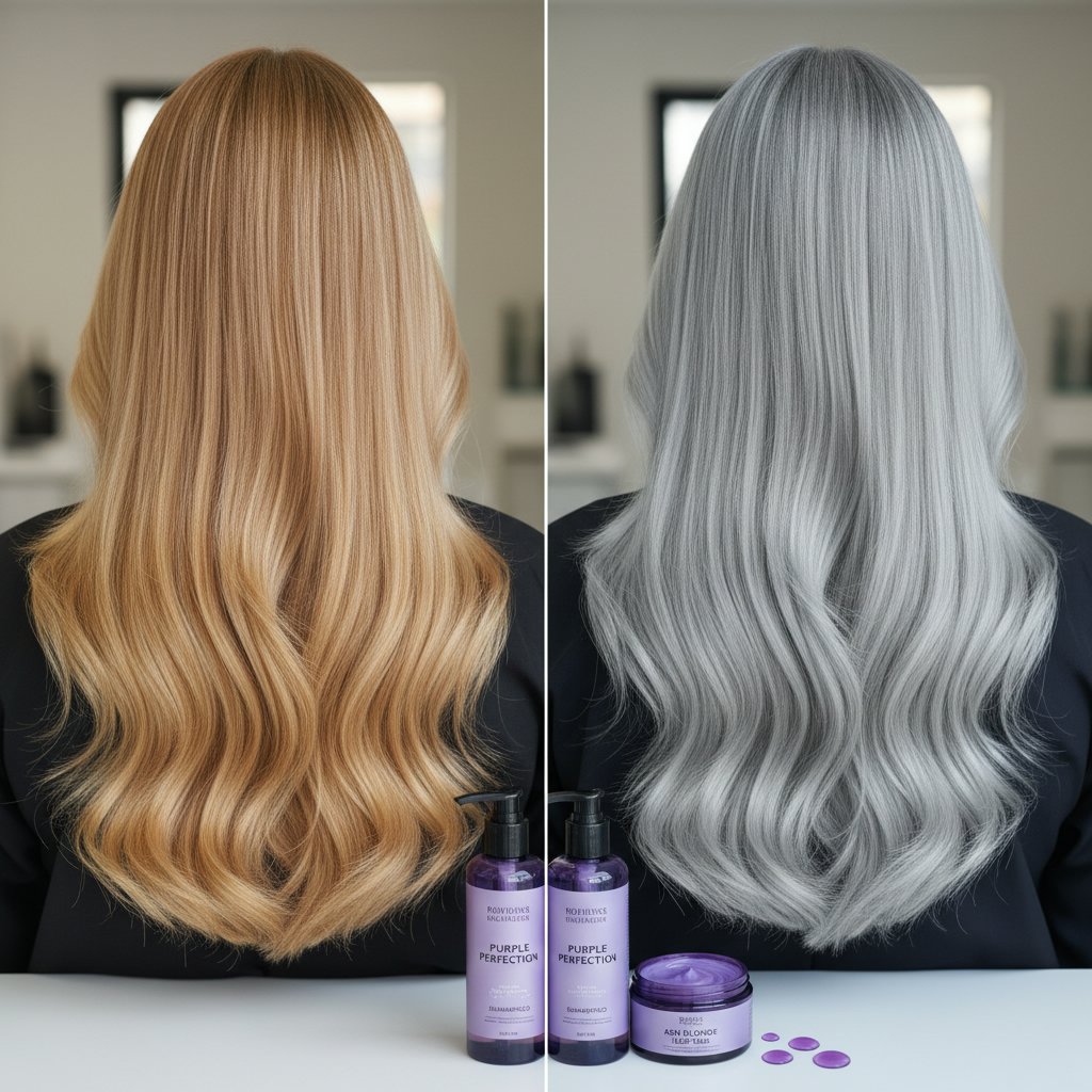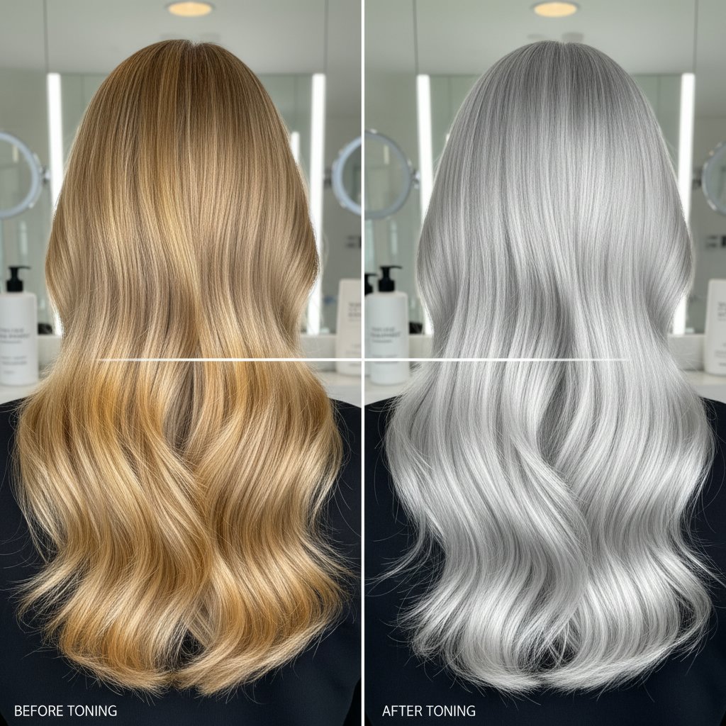 Before: Brassy, yellow tones. After: Gleaming, cool blonde achieved with toning shampoos and color-safe treatments.