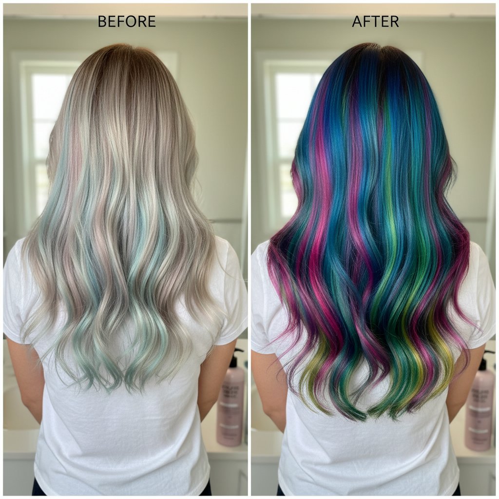 Before: Faded fantasy colors. After: Bold, vivid fantasy hues maintained with sulfate-free, color-safe products.