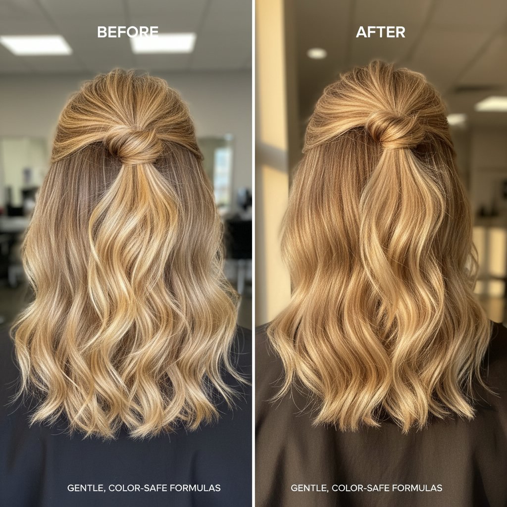 Before: Overprocessed, dull highlights. After: Sun-kissed, luminous highlights refreshed with gentle, color-safe formulas.