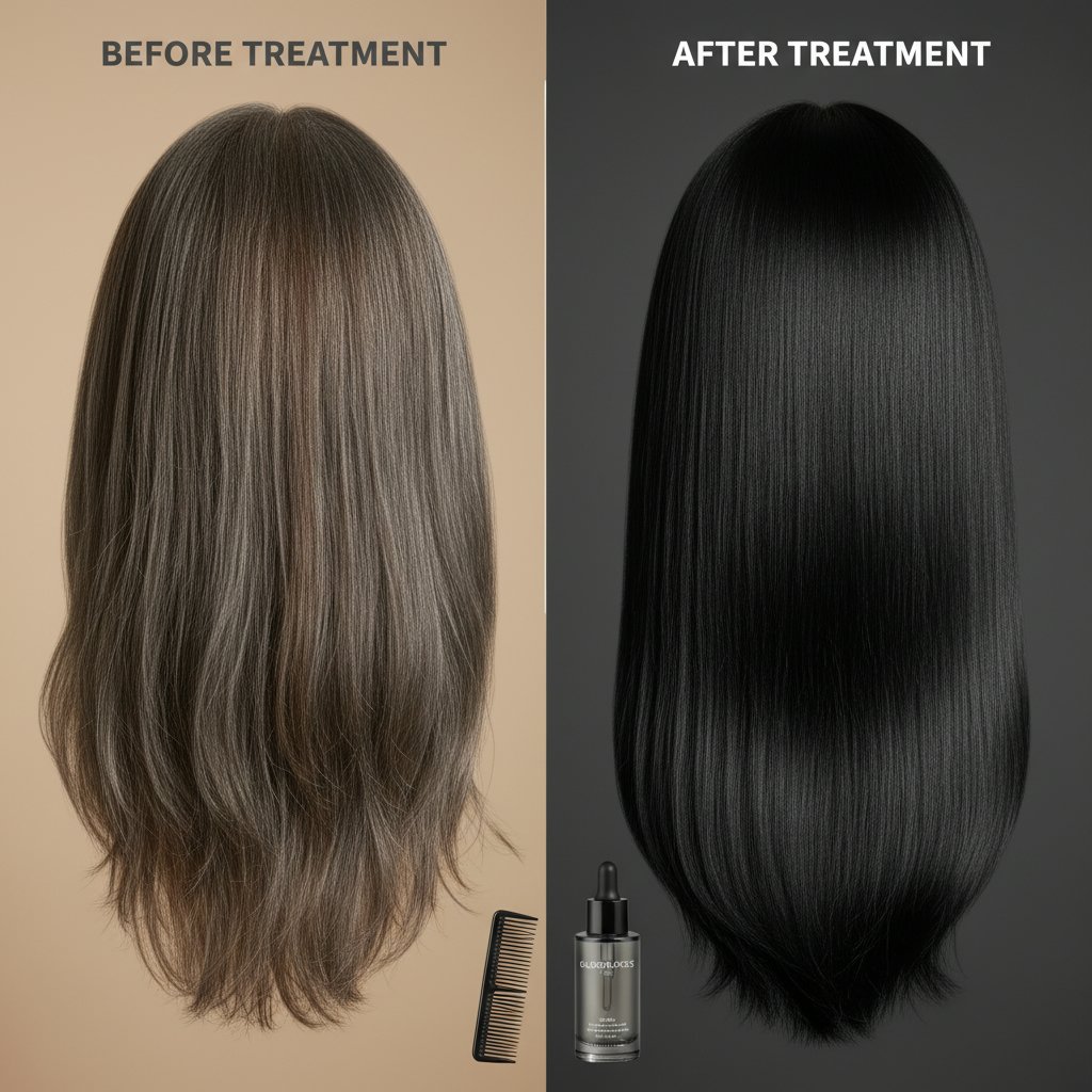 Before: Fading to a dull grey. After: Lustrous jet black restored, achieving a sleek, polished look with shine-enhancing treatments.